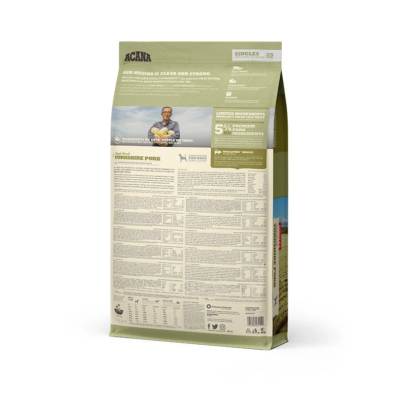 Формула ACANA Yorkshire Pork містить єдине джерело м'ясних білків у співвідношенні WholePrey, включаючи м'ясо, органи та хрящі.