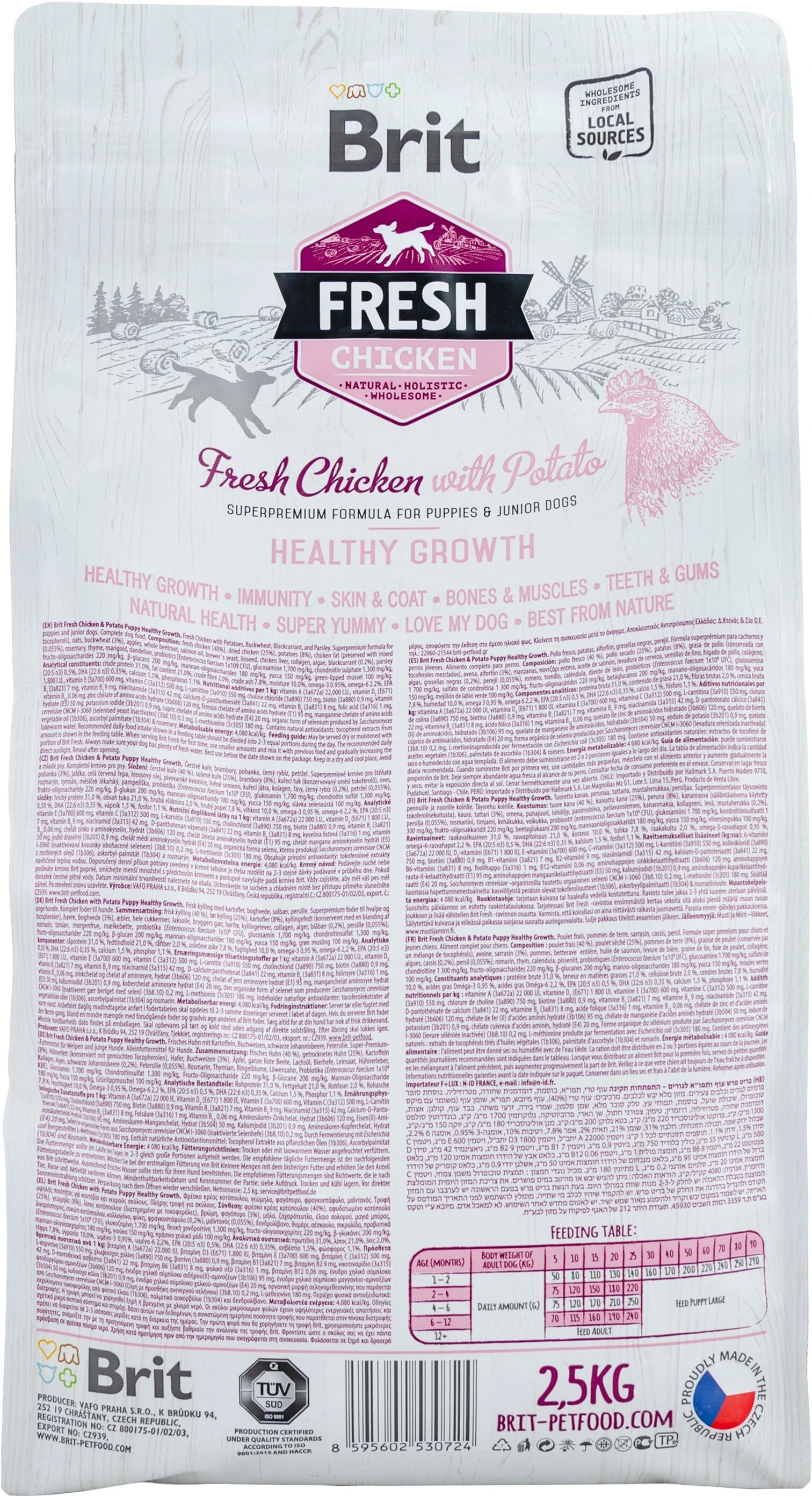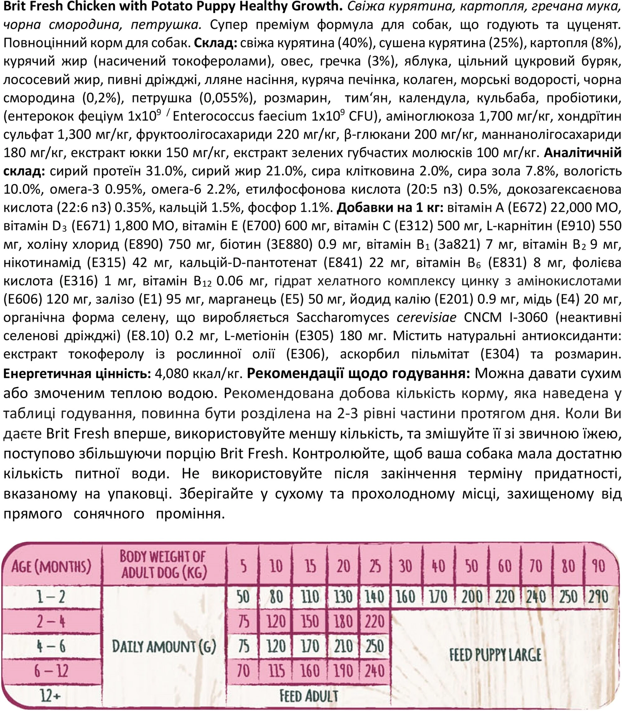 Склад: свіжа курка (40%), сушена курка (25%), картопля (8%), курячий жир (консервований зі змішаними токоферолами), овес, гречка (3%), яблука, буряк, лососеве масло, пивні дріжджі, насіння льону, куряча печінка, коллаген, водорості, чорна смородина (0.2%), петрушка (0.055%), розмарин, чебрець, бархатці, кульбаба, пробіотики (Enterococcus faecium 1x109 КОЕ), глюкозамін 1700 мг/кг, хондроїтин сульфат 1300 мг/кг, Фруктоолігосахариди 220 мг/кг, β-глюкани 200 мг/кг, Маннанолігосахариди 180 мг/кг, Юкка 150 мг/кг, Зелено-листа мідія 100 мг/кг.