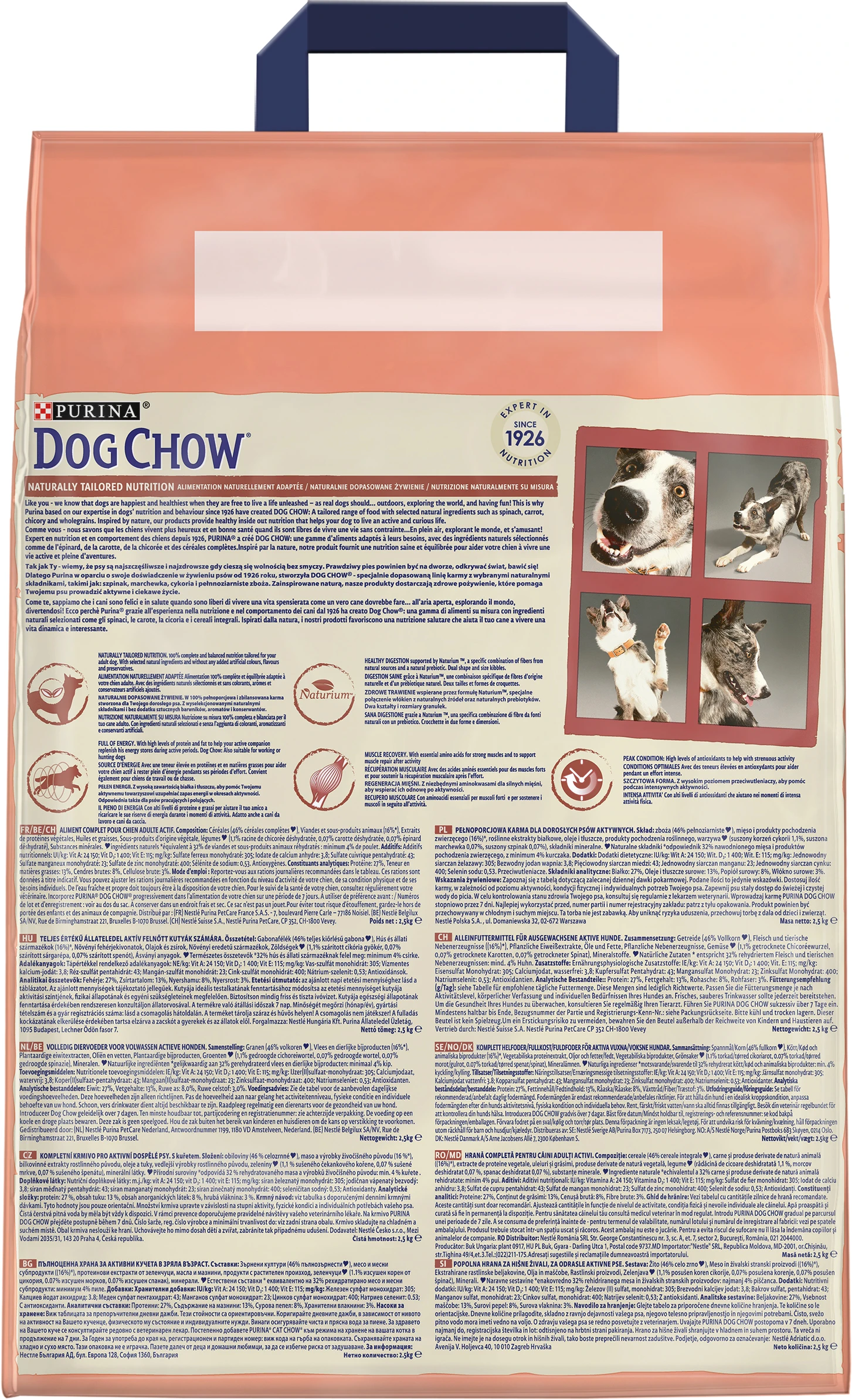 Если ваша собака активна целый день, ей нужно полноценное питание, которое будет восстанавливать все сожженные калории. Вот почему Dog Chow для взрослых, активных и рабочих собак, содержит все питательные вещества для рабочих и активных собак, которым нужно оставаться в форме, а незаменимые аминикислоты помогают поддерживать мышцы сильными и помогают в их восстановлении. В состав корма также входят отборные природные ингредиенты и натуральные пребиотики, которые способствуют поддержанию здоровья пищеварительной системы. Рацион Dog Chow создан без добавления искусственных красителей, ароматизаторов и консервантов.