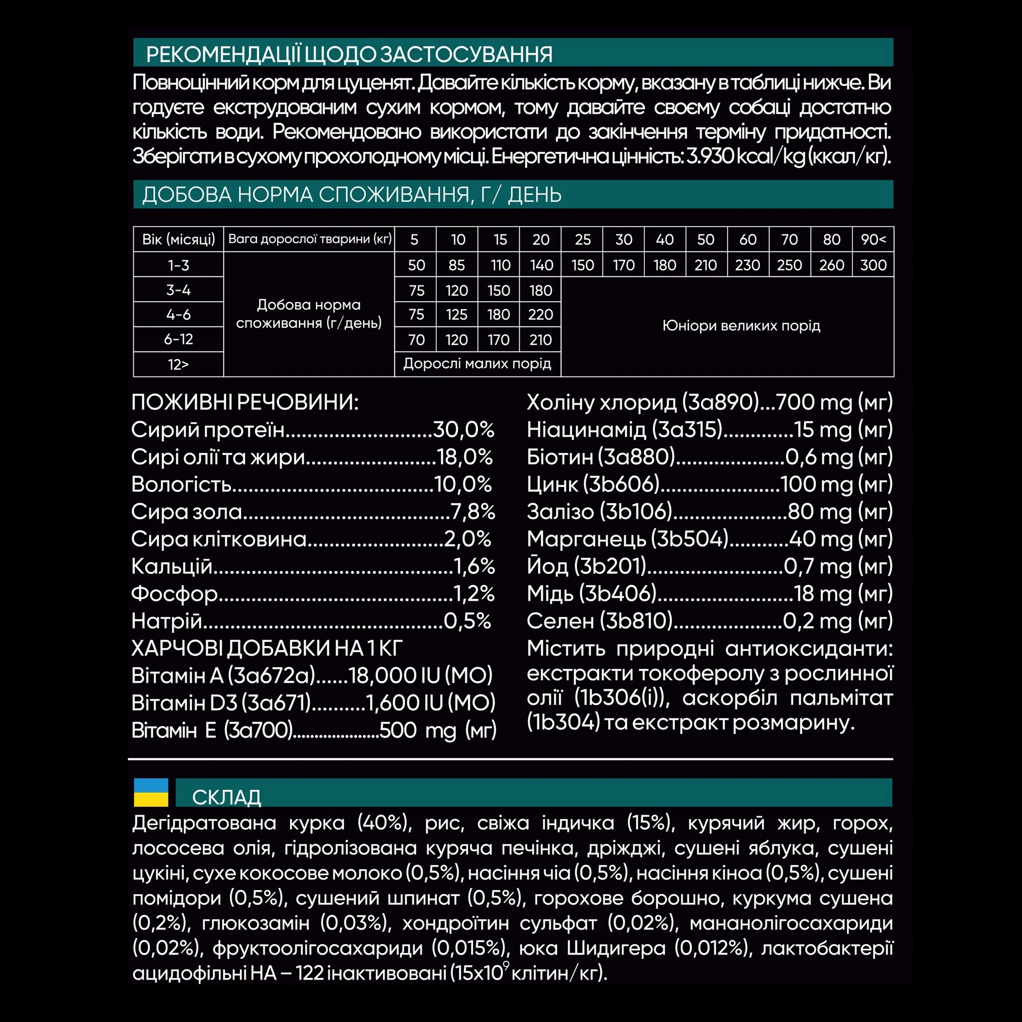 Склад: дегідратована курка (40%), рис, свіжа індичка (15%), курячий жир, горох, лососеве масло, гідролізат курячої печінки, дріжджі, сушені яблука, сушені кабачки (1%), сухе кокосове молоко (0.5%), насіння чіа (0.5%), насіння кіноа (0.5%), сушені помідори (0.5%), сушений шпинат (0.5%), горохова мука, сушений куркума (0.2%), глюкозамін (0.03%), хондроїтин сульфат (0.02%), маннанолігосахариди (0.02%), фруктолігосахариди (0.015%), юкка Шидигера (0.012%), інактивована Lactobacillus acidophilus HA — 122 (15x10^9 клітин/кг).