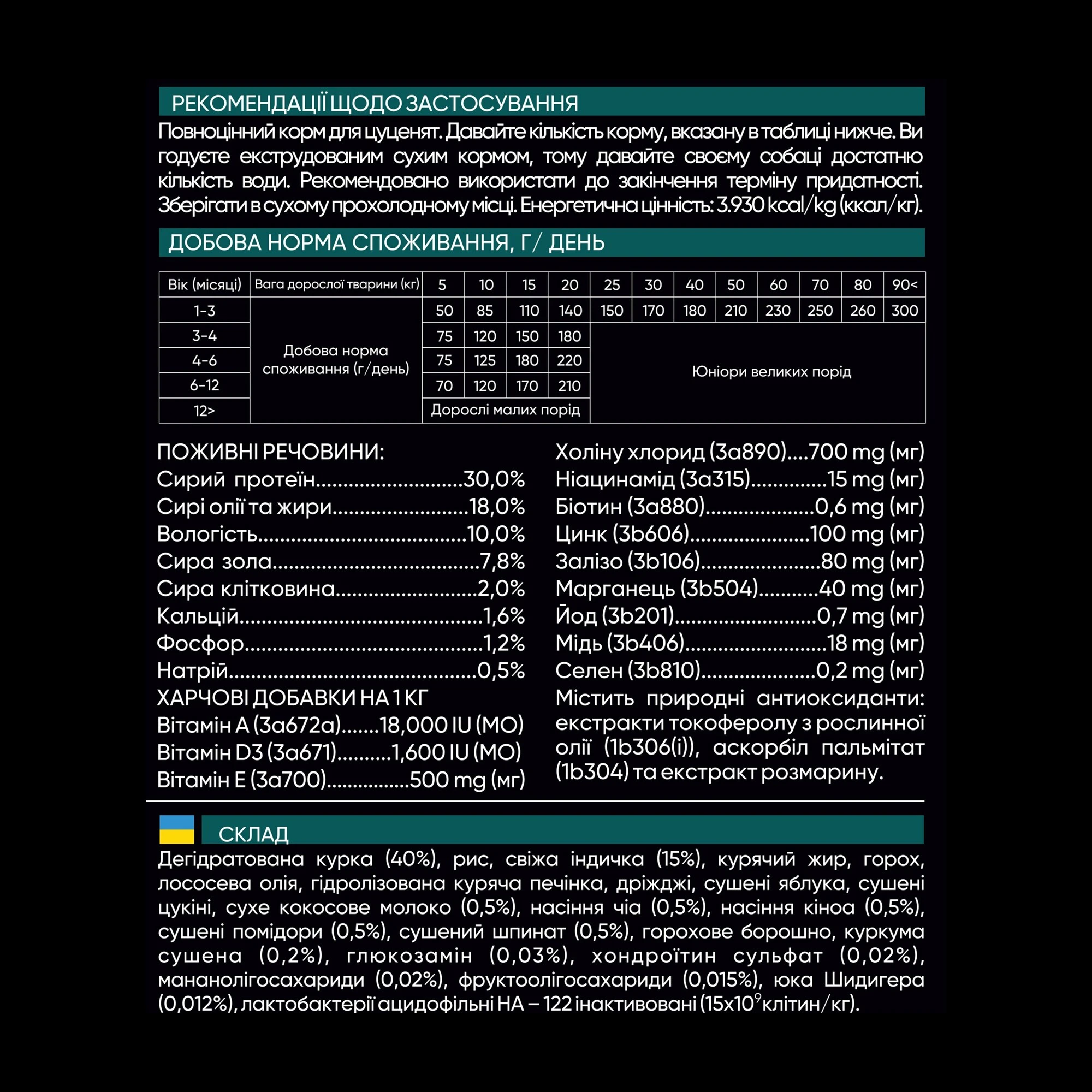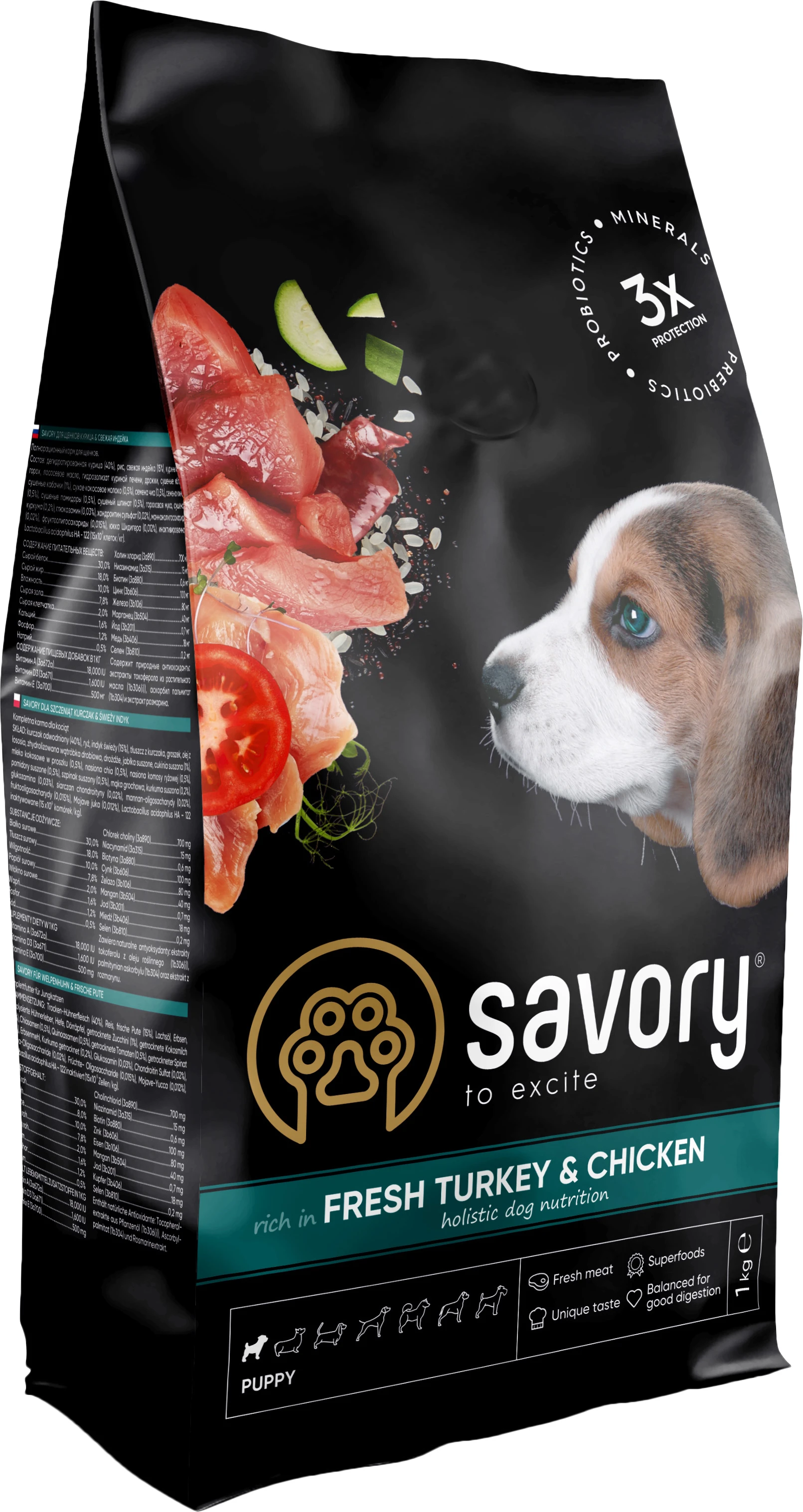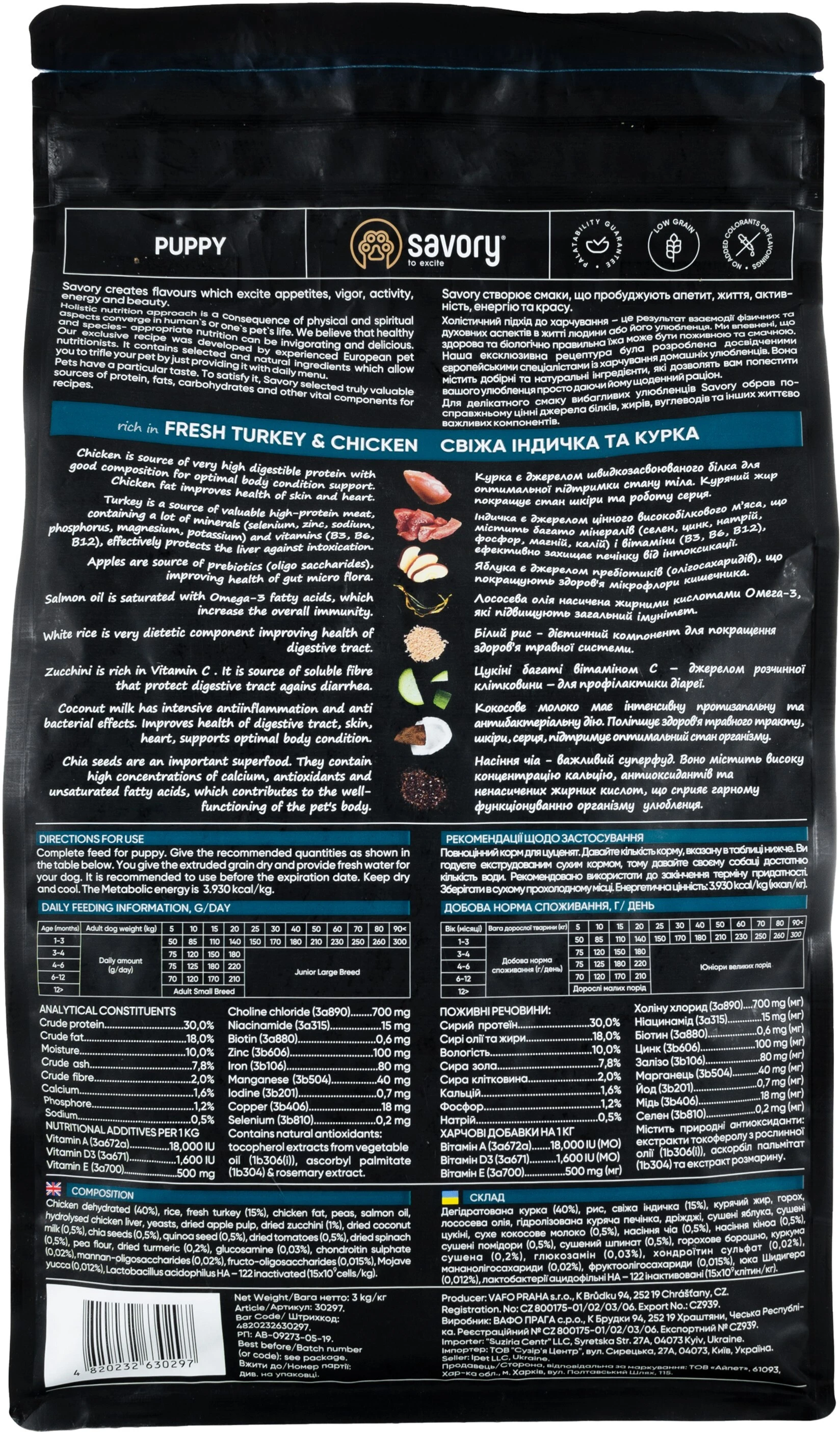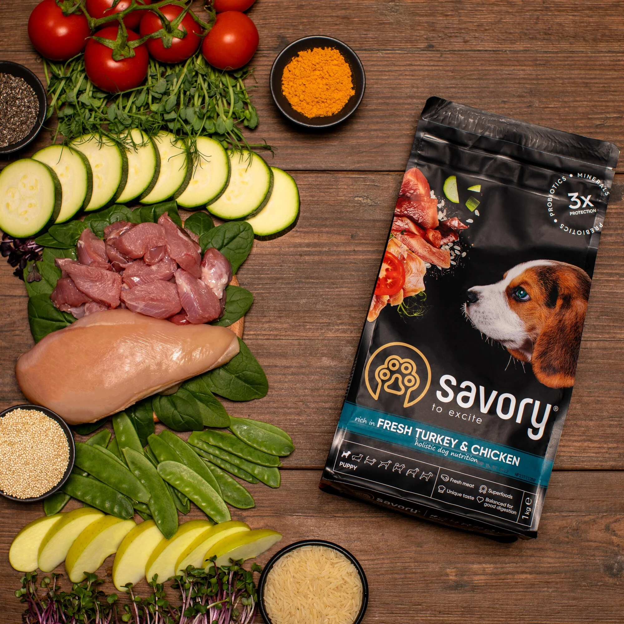 Сухий корм для цуценят Savory містить 55% якісного м'яса індички та курки, суперфуди, яблука, цукіні, шпинат. Ці компоненти створені природою для здорового росту та гармонійного розвитку малюка.