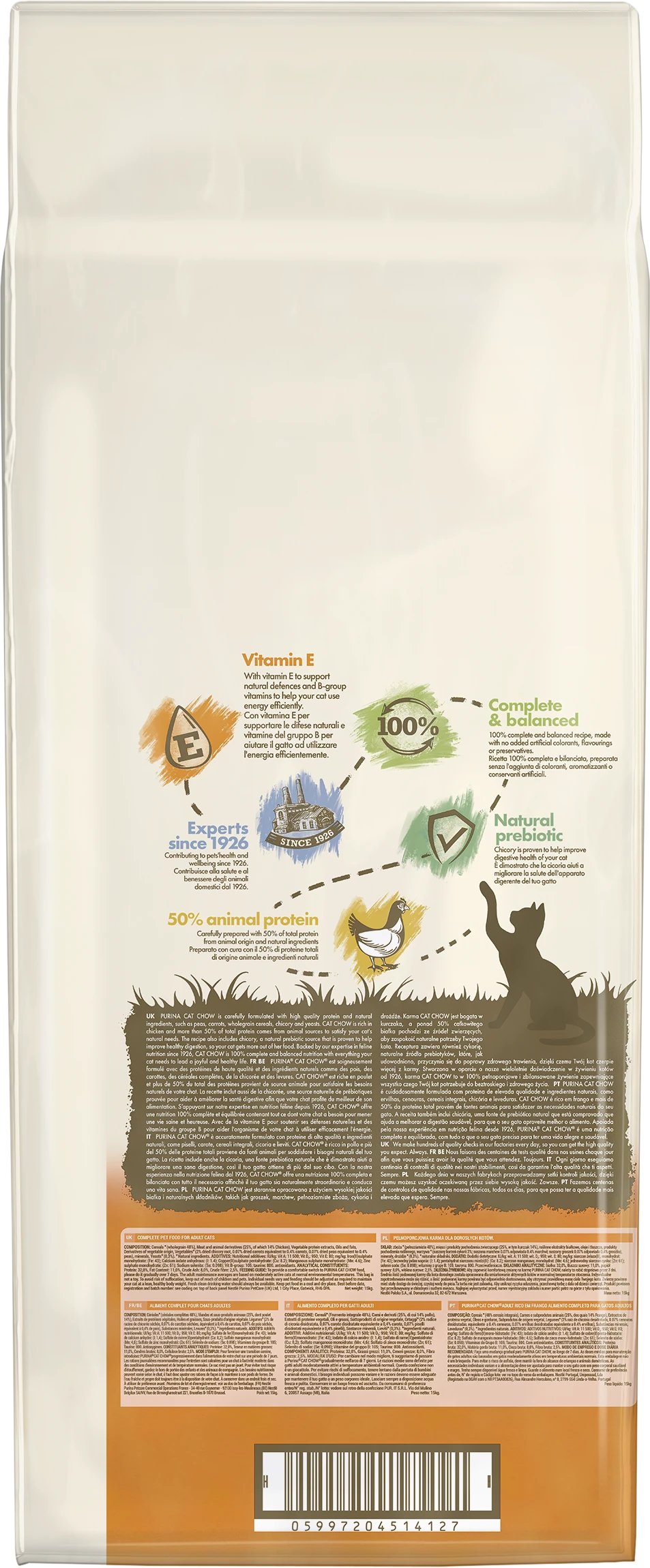В состав корма для кошек Cat Chow (Кэт Чау) входят белок высокого качества и натуральные ингредиенты: горох, морковь, цельные злаки, цикорий и дрожжи. Cat Chow (Кэт Чау) содержит в составе курятину. 50% белков в составе продукта - животного происхождения, что помогает удовлетворить потребности кошки. Рецептура корма также включает в себя цикорий, который является натуральным источником пребиотика, направленным на улучшение пищеварения, поэтому ваш котик получит максимум пользы из пищи, которую он потребляет.
