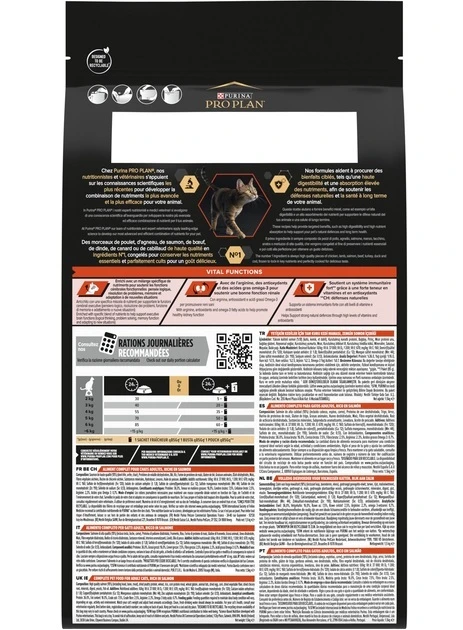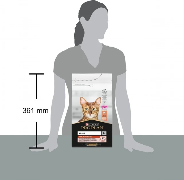 Purina Pro Plan Adult 1+ Vital Functions – корм для котів, що містить набір необхідних поживних речовин, вітаміни А, С і Е та натуральний пребіотик. Допомагає підтримувати органи чуття. Унікальна формула корму сприяє здоров'ю нирок. Підтримує здоров'я імунної системи завдяки високому вмісту антиоксидантів, таких як вітаміни C і E. Цей корм для котів допомагає запобігати утворенню нальоту і зубного каменю завдяки спеціальній текстурі крокетів та особливим мінералам, які значно знижують ймовірність появи зубного нальоту.