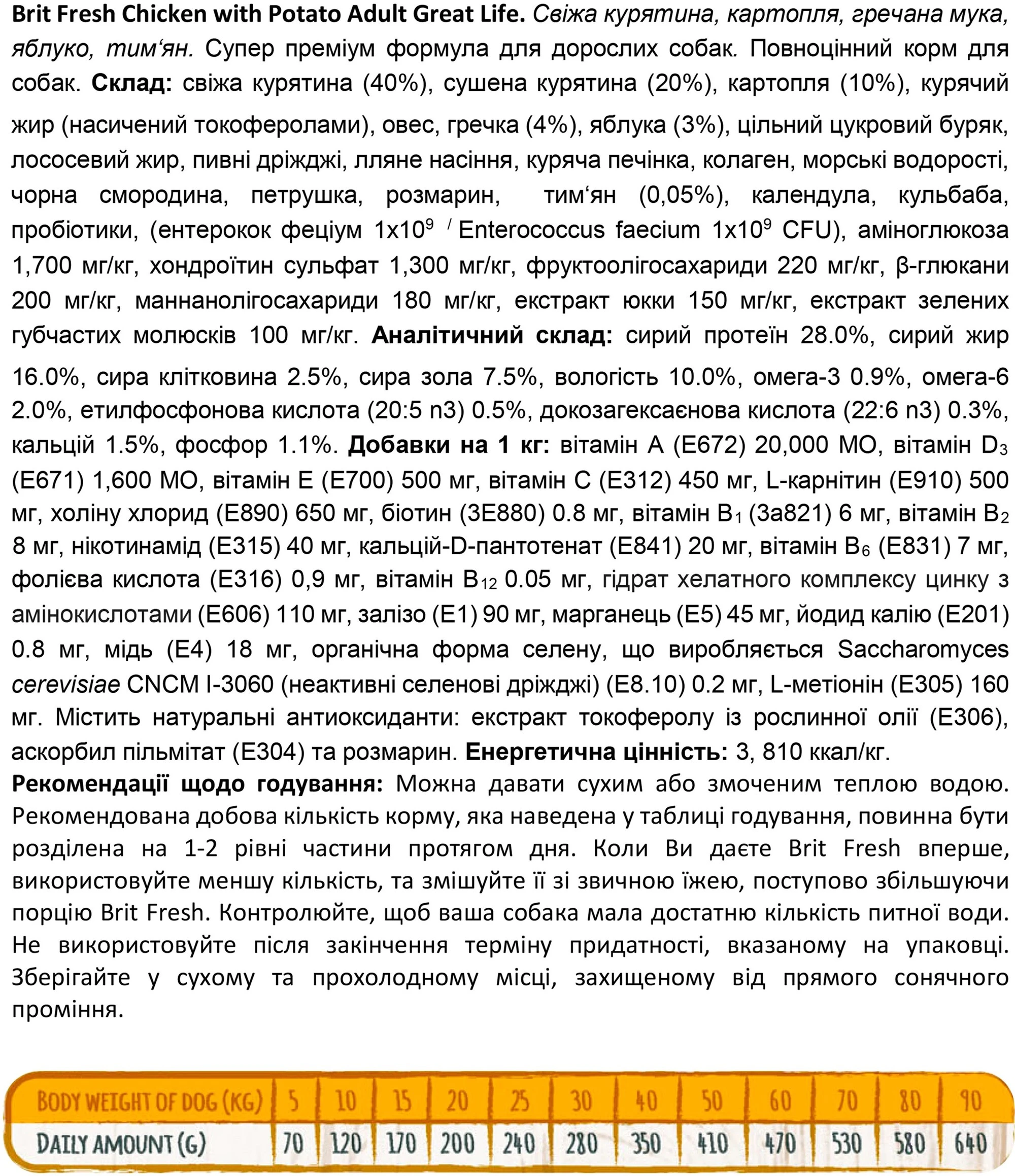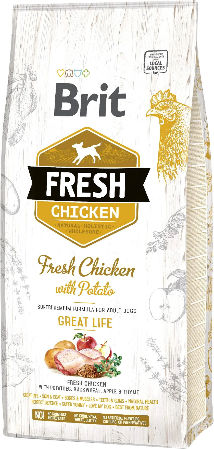 Склад: свіжа курка (40%), сушена курка (20%), картопля (10%), курячий жир (консервований зі змішаними токоферолами), овес, гречка (4%), яблука (3%), буряк, лососеве масло, пивні дріжджі, лляне насіння, куряча печінка, коллаген, водорості, чорна смородина, петрушка, розмарин, чебрець (0.05%), бархатці, кульбаба, пробіотики (Enterococcus faecium 1x109 КОЕ), глюкозамін 1700 мг/кг, хондроїтин сульфат 1300 мг/кг, фруктолігосахариди 220 мг/кг, β-глюкани 200 мг/кг, маннанолігосахариди 180 мг/кг, юка 150 мг/кг, зеленолисті мідії 100 мг/кг.