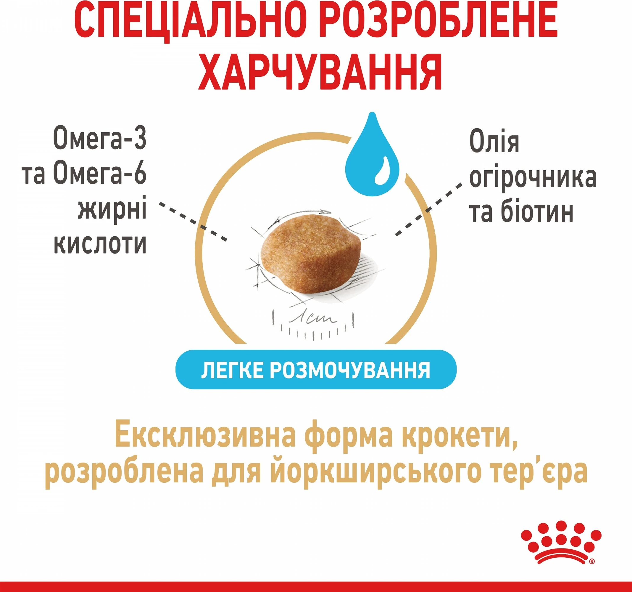 Форма, розмір, текстура та формула крокет адаптовані для маленької щелепи йоркширського тер'єру зрілого віку. Ця формула містить хелатори кальцію для підтримки здоров'я зубів. Крокети можна розмочити теплою водою, що полегшує вживання корму та збільшує його смакову привабливість.