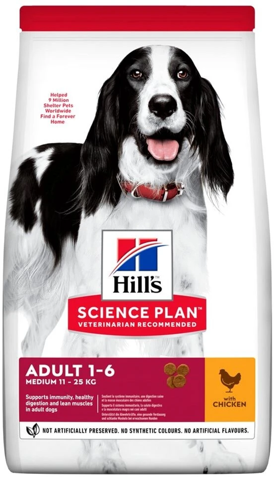 Hill's Science Plan Adult Medium Breed - повнораціонне харчування для дорослих собак віком від 1 до 6 років і вагою від 10 до 25 кг забезпечує улюбленця необхідними вітамінами та мікроелементами.