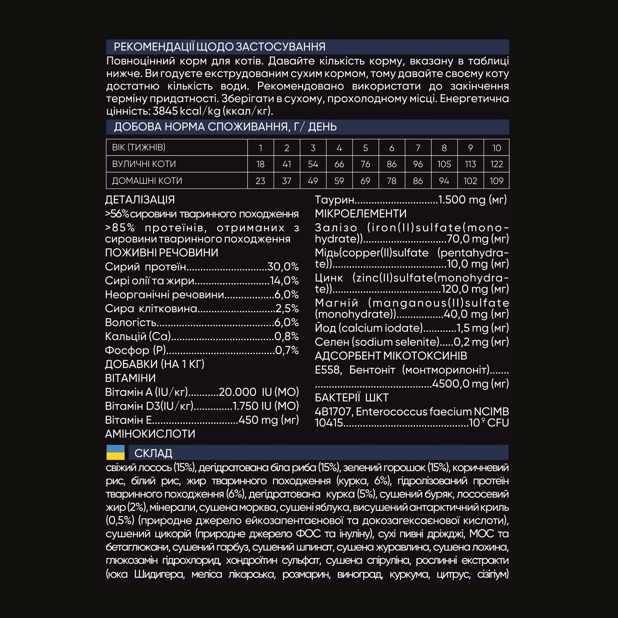 Склад: свіже м'ясо лосося (15%), дегідратоване м'ясо білої риби (15%), зелений горошок (15%), коричневий рис, білий рис, жир тваринного походження (курка, 6%), гідролізований протеїн тваринного походження (6%), дегідратована курка (5%), сушена буряк, лососевий жир (2%), мінерали, сушена морква, сушені яблука, висушений антарктичний криль (0.5%) (натуральне джерело ейкозапентаєнової та докозагексаєнової кислоти), сушений цикорій (натуральне джерело ФОС та інуліну), сухі пивні дріжджі, МОС та бетаглюкан, сушена гарбуз, сушений шпинат, сушена журавлина, сушена голубика, глюкозамін гідрохлорид, хондроїтин сульфат, сушена спіруліна, рослинні екстракти (юка Шидигера, меліса лікарська, розмарин, виноград, куркума, цитрус, сизигіум).