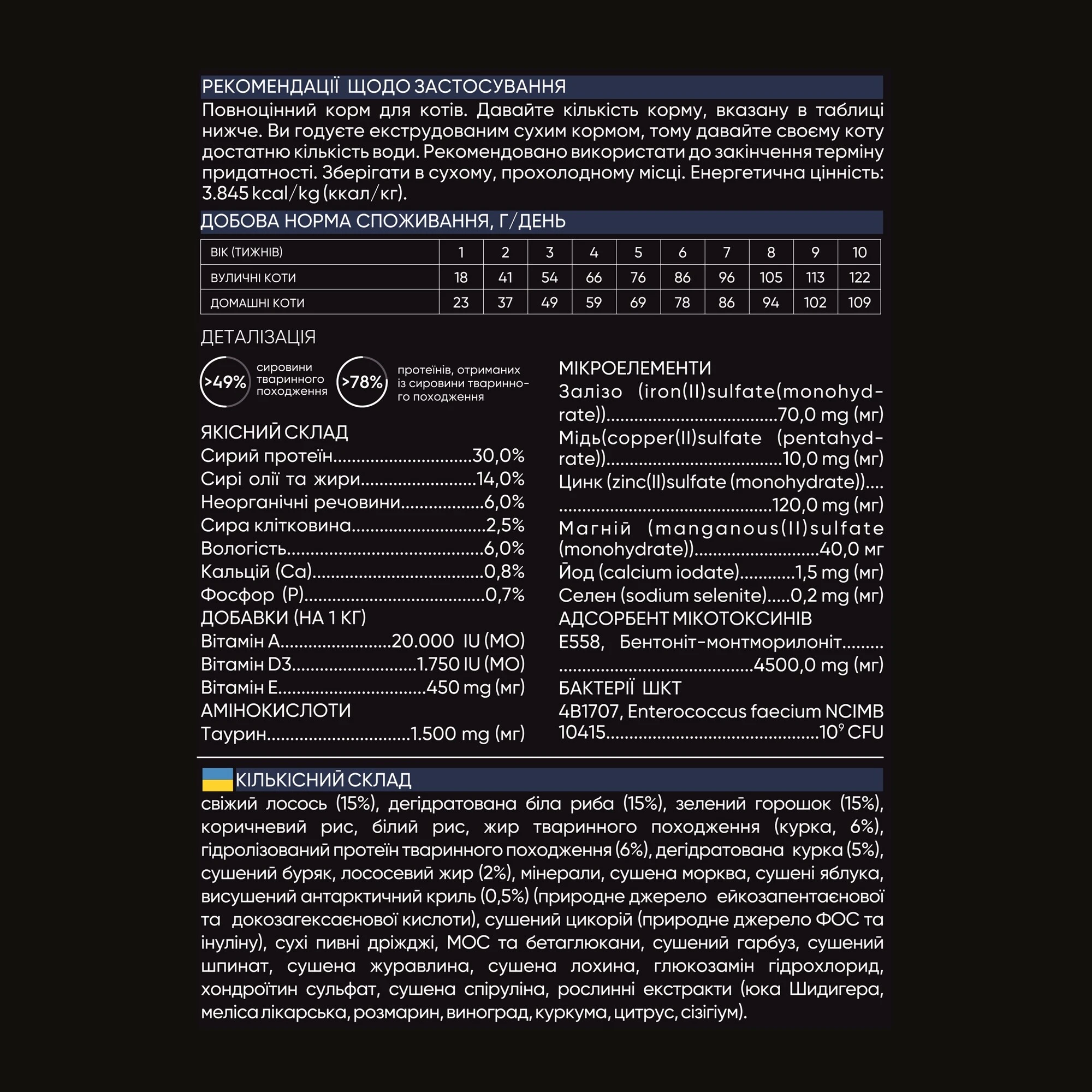 Поживні речовини: сирий протеїн 30.0%, сирі олії та жири 14,0%, неорганічні речовини 6.0%, сирий клітковина 2.5%, вологість 6.0%.