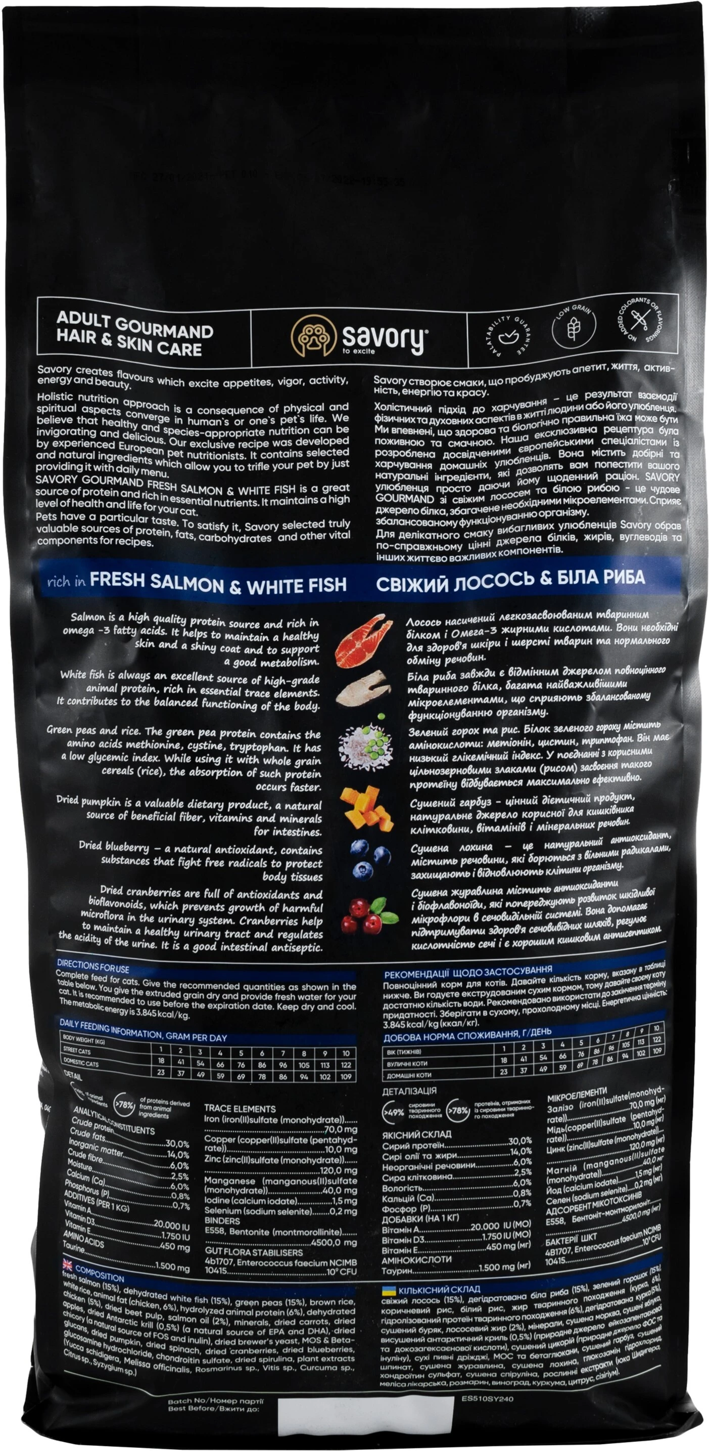 Сухий корм для котів Savory містить свіже м'ясо лосося та дегідратоване м'ясо білої риби, ягоди, фрукти та овочі. Ці компоненти створені природою, щоб забезпечити збалансоване функціонування організму котика та надати його шерсті надзвичайний вигляд.