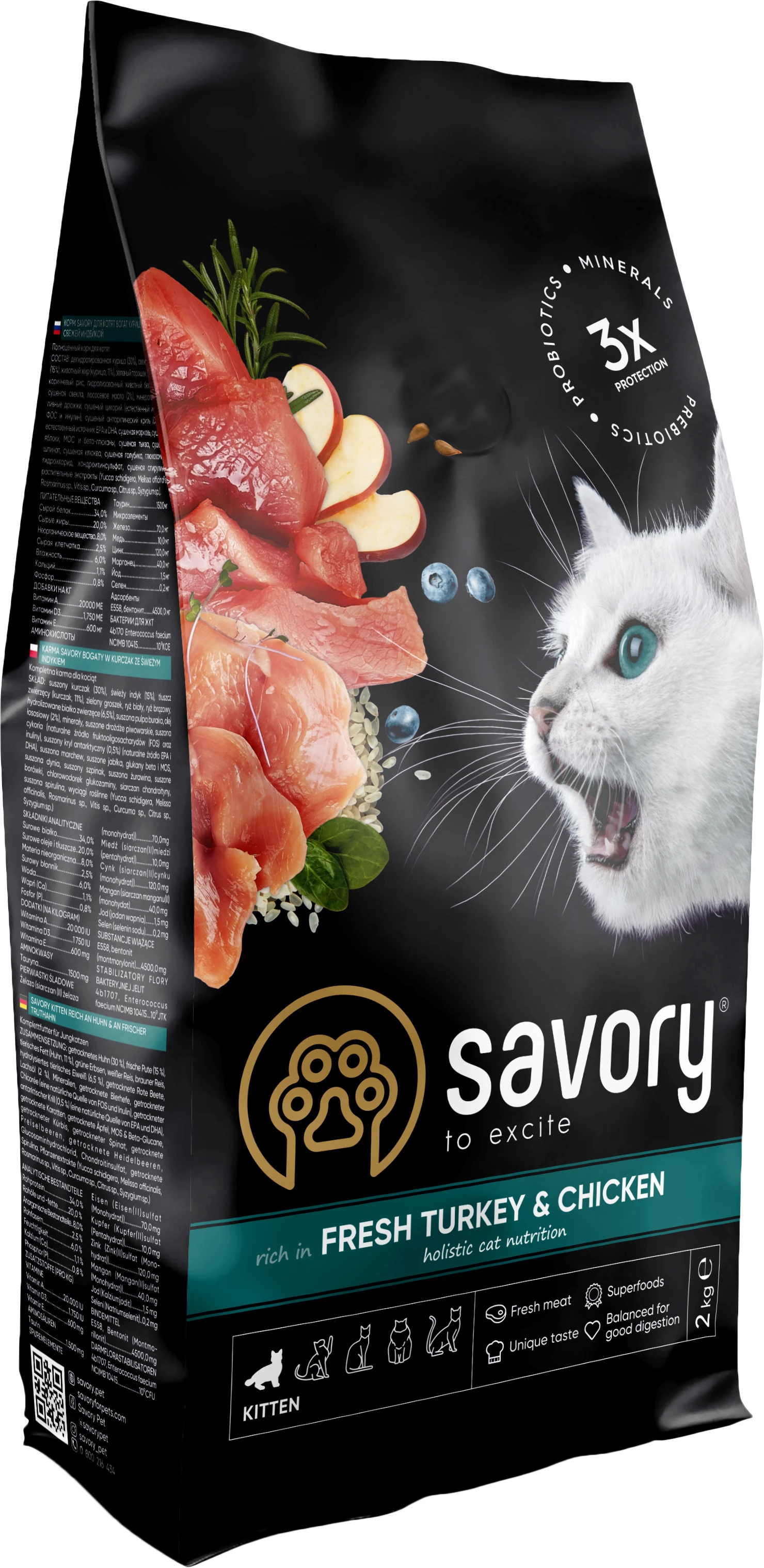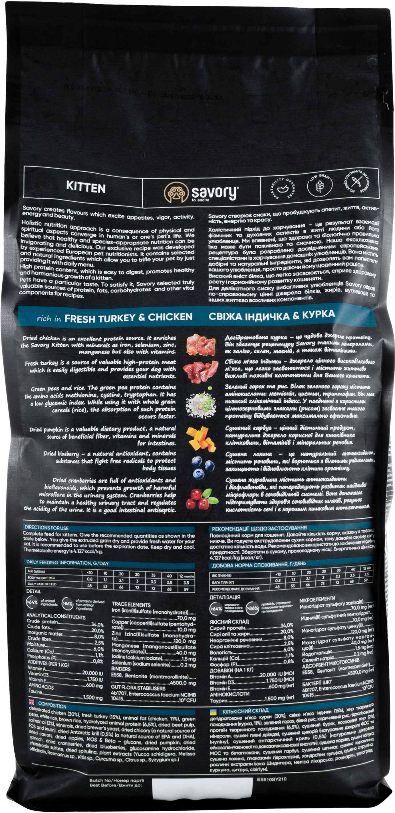 Сухий корм для кошенят Savory містить свіже м'ясо індички та дегідратоване м'ясо курки, ягоди, фрукти та овочі. Ці компоненти створені природою, щоб організм малюків отримав необхідні поживні речовини для зміцнення імунітету, правильного розвитку та здорового зростання.