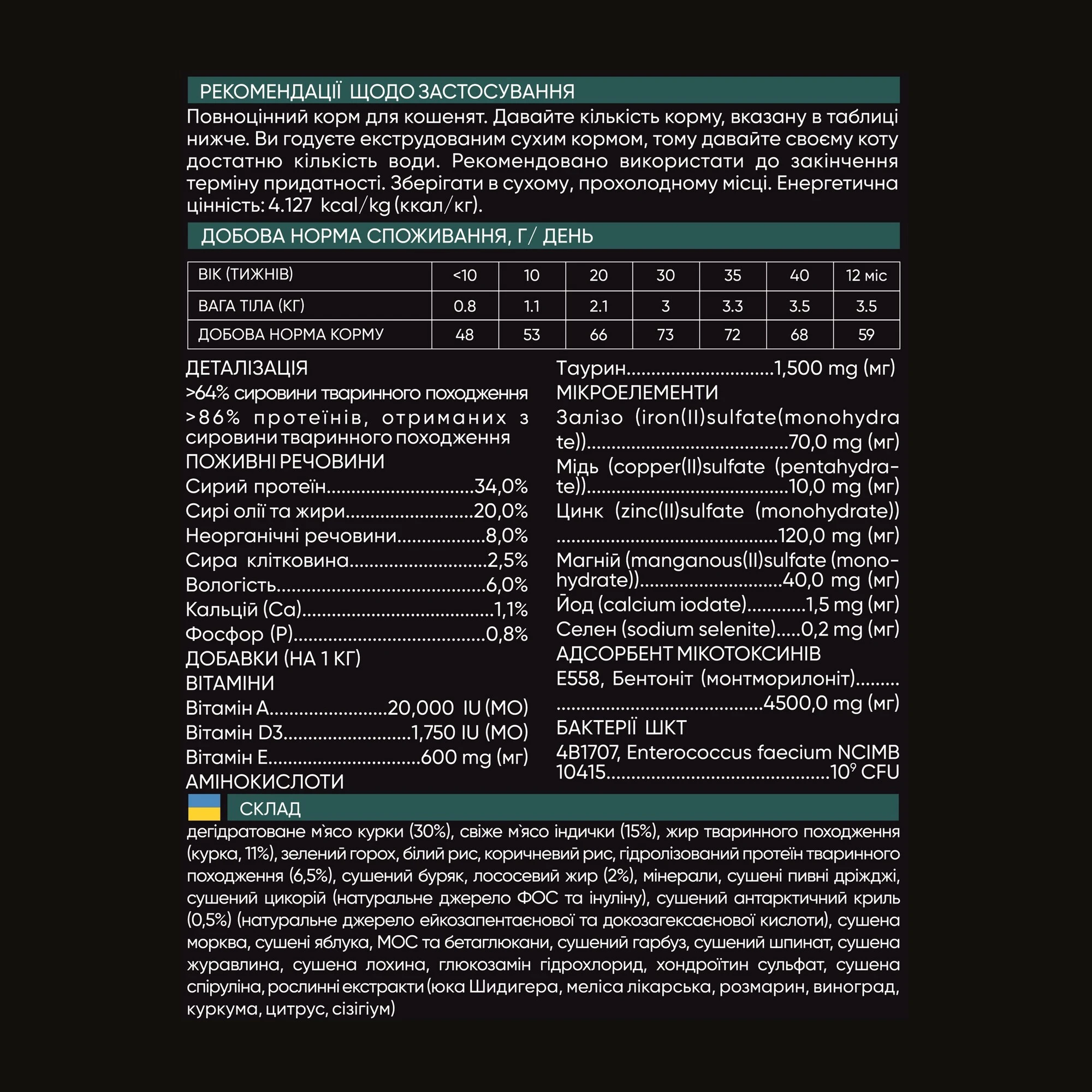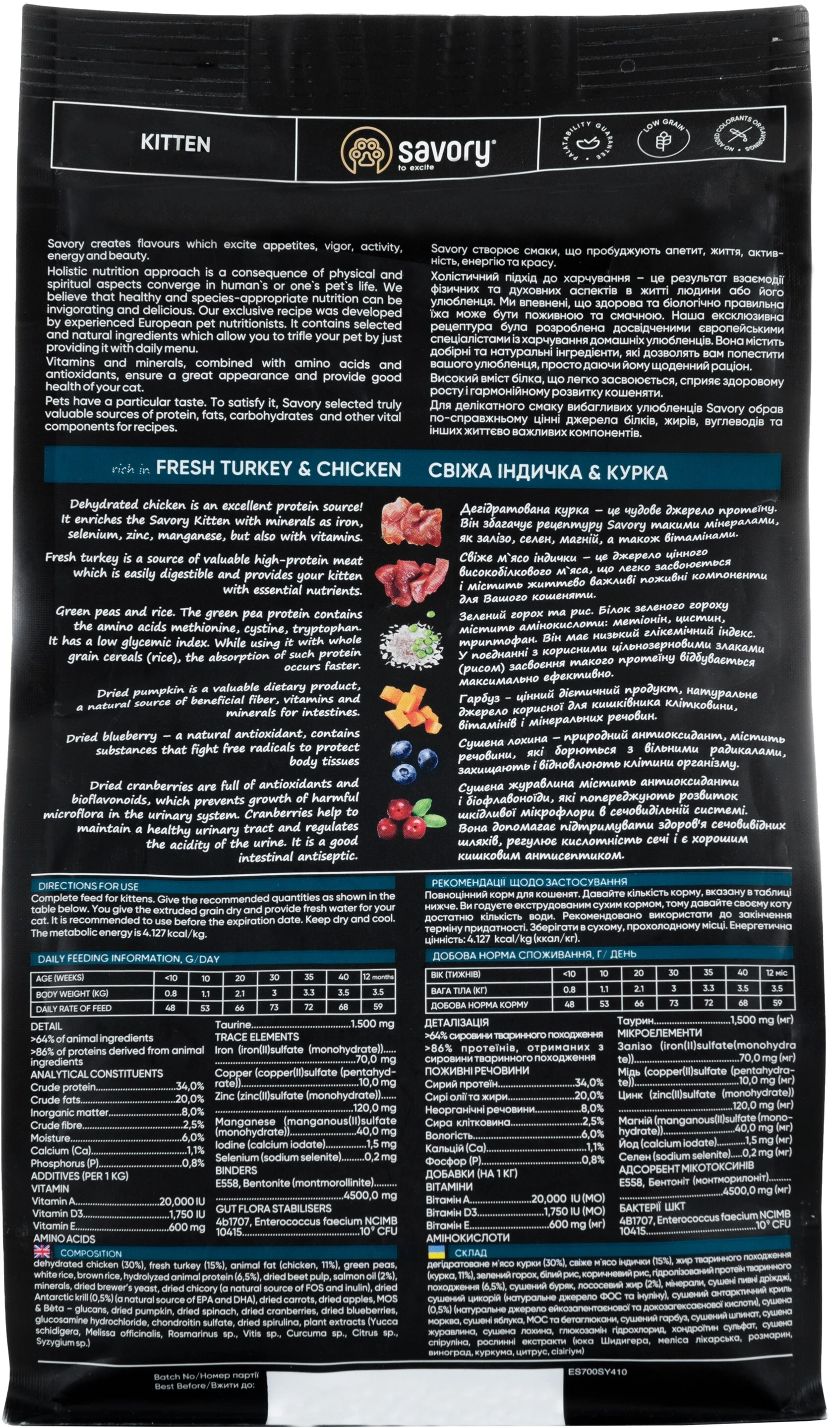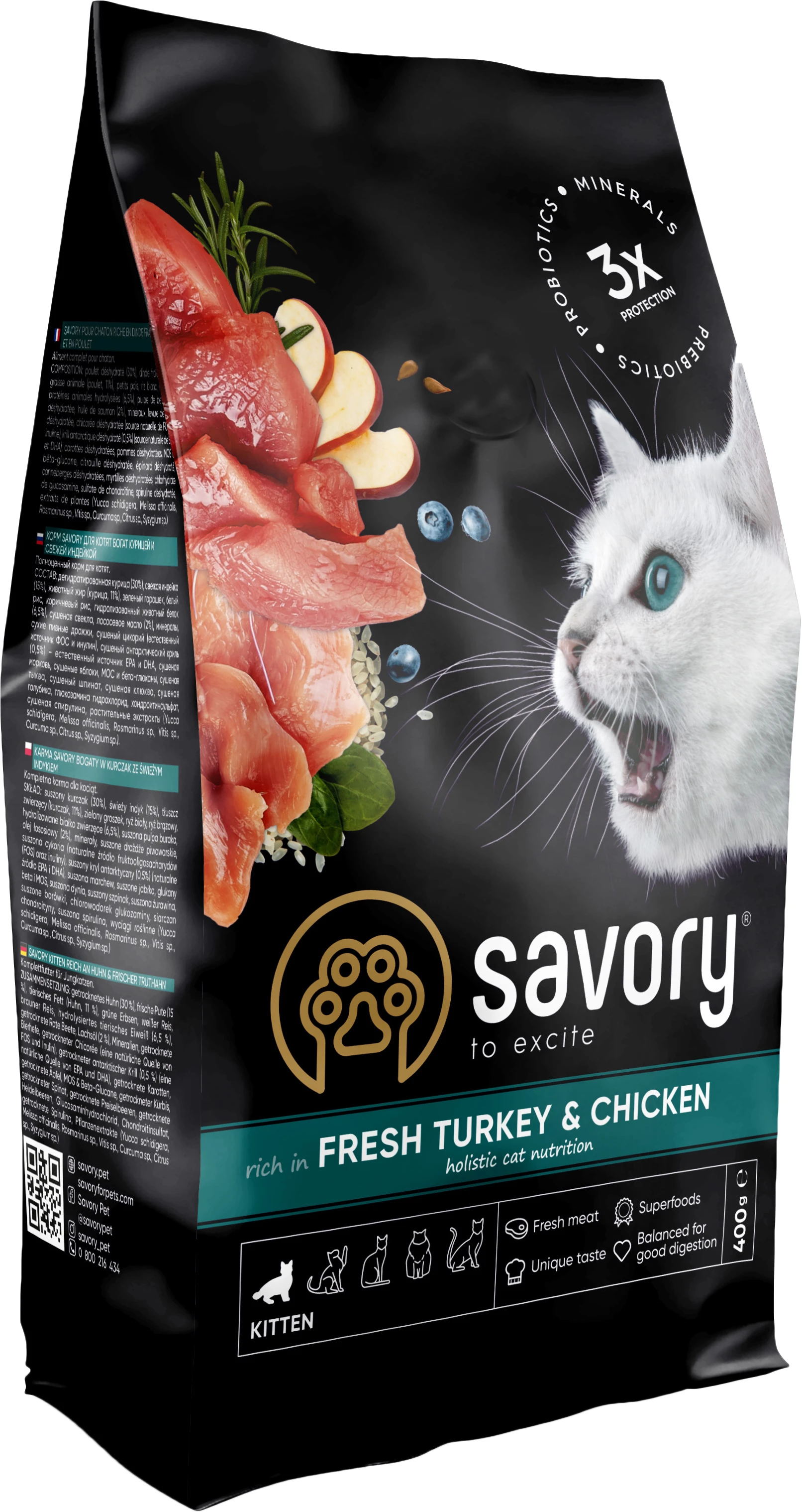 Сухий корм для кошенят Savory містить свіже м'ясо індички та дегідратоване м'ясо курки, ягоди, фрукти та овочі. Ці компоненти створені природою, щоб організм малюків отримав необхідні поживні речовини для зміцнення імунітету, правильного розвитку та здорового зростання.