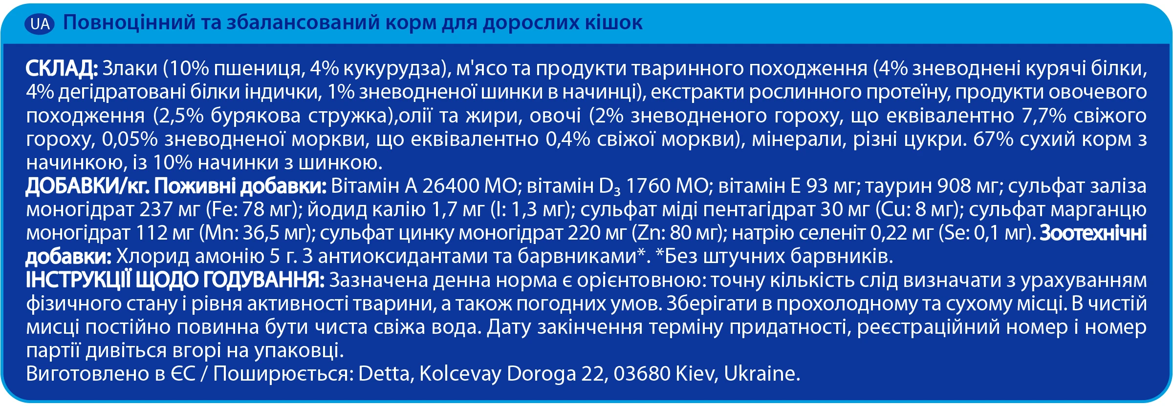 ДОБАВКИ / кг. Питательные добавки: Витамин А 26400 МЕ витамин D3 1760 МЕ витамин Е 93 мг таурин 908 мг сульфат железа моногидрат 237 мг (Fe 78 мг) йодид калия 1,7 мг (1: 1.3 мг) сульфат меди пентагидрат 30 мг (Сu 8 мг) сульфат марганца моногидрат 112 мг (Mn: 36.5 мг) сульфат цинка моногидрат 220 мг (Zn 80 мг) натрия селенит 0.22 мг (Se: 0.1 мг). Зоотехнические добавки: Хлорид аммония 5 г. С антиоксидантами и красителями *. * Без искусственных красителей.