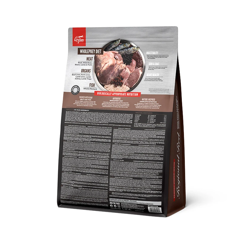 Раціон ОРИЖЕН РЕГІОНАЛ РЕД КЕТ забезпечує вашого кота високопоживними протеїнами та нутрієнтами, в яких вони потребують, з свіжих або сирих інгредієнтів, таких як м'ясо бичків, дикого кабана, бізона, ягняти та поросят. Раціон ORIJEN Regional Red виготовлений з найбільш поживних та соковитих частин здобичі, представлених м'язевим м'ясом, високопоживними органами та їстівними кістками в співвідношенні WholePrey, забезпечуючи котів харчуванням, в якому вони потребують.