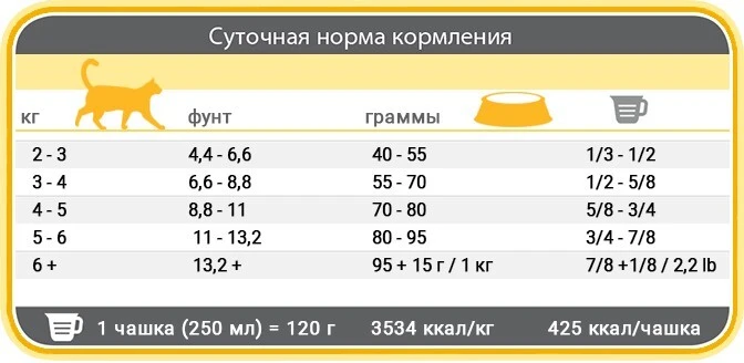 протеїн – 27%, жир – 15%, клітковина – 3%, зола – 8%, кальцій – 1%, фосфор – 0,8%, магній – 0,1%, таурин – 2100 мг/кг, глюкозаміну сульфат – 500 мг/кг, хондроїтину сульфат – 250 мг/кг.