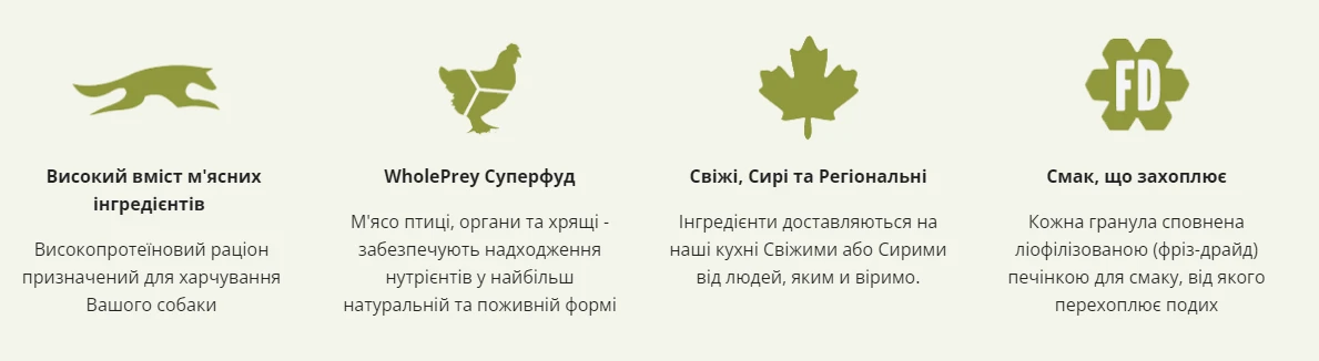 Свіже куряче м'ясо (19%), борошно з курки (18,5%), червона чечевиця, зелений горошок, борошно з індички (6%), свіжа печінка курчати (печінка, серце) (5%), борошно з оселедця (4% ), клітковина з горошка, яйця (4%), сирий камбала(4%), риб'ячий жир (3%), нут, зелена чечевиця, жовтий горошок, крохмаль з гороху, курячий жир (1%), сире печінка індички (0,5%), висушена ламінарія, гарбуз, мускатна диня, свіжа морква, свіжі яблука, свіжі груші, свіжі цукіні, висушений корінь цикория, капуста кале, шпинат, свіжа зелень репи, зелень буряка, свіжі ягоди ирги, куркума, расторопша, корінь лопуха, лаванда, корінь алтея, плоди шипшини.
