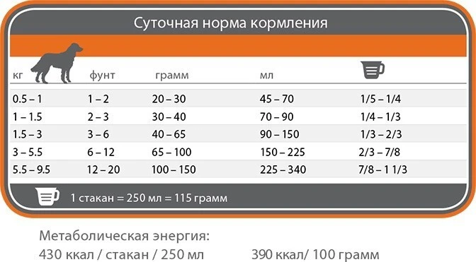 протеин – 22%, жир – 12%, клетчатка – 3%, зола – 7%, кальций – 1,2%, фосфор – 0,75%, Омега-3 – 0,4%, Омега-6 – 2,3 %, Омега-9 – 0,15%, глюкозамина сульфат – 500 мг/кг, хондроитина сульфат – 250 мг/кг.