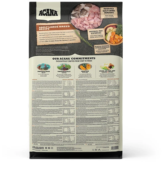Коли йдеться про корм ACANA, кожен інгредієнт має значення. Саме тому рецептура Adult Large Breed Recipe створюється з турботою, щоб забезпечити унікальні потреби собак великих порід у харчуванні. Рецептура Акана Едалт Лардж Брид Ресипе на 60% переповнена якісними м'ясними інгредієнтами, такими як м'ясо канадських курчат і сирої камбали, і на 40% збалансована фруктами, овочами та травами.
