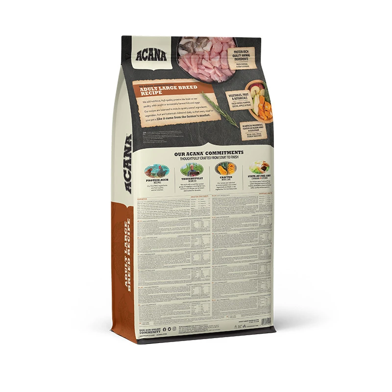 Рецептура приготована з якісних м'ясних інгредієнтів і збалансована фруктами та травами, які доставляються на кухні компанії Champion Petfoods щодня. Кожна порція корму Акана Едалт Лардж Брид Ресипе забезпечує вашу собаку харчуванням, як би воно прибувало до вас на кухню з фермерських ринків.