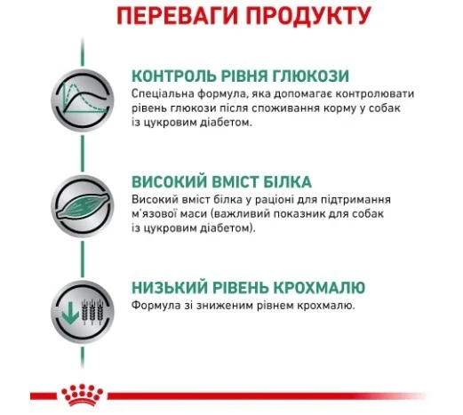 Спеціальна формула, яка допомагає контролювати рівень глюкози після вживання корму у собак із цукровим діабетом.