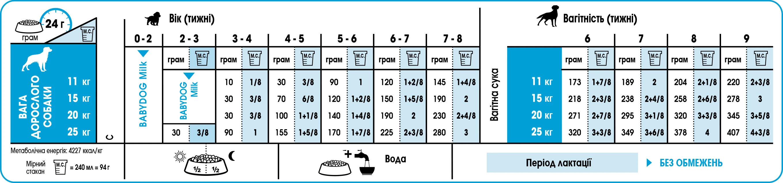 Поживний профіль, адаптований до високих енергетичних потреб суки наприкінці періоду вагітності та під час лактації.
