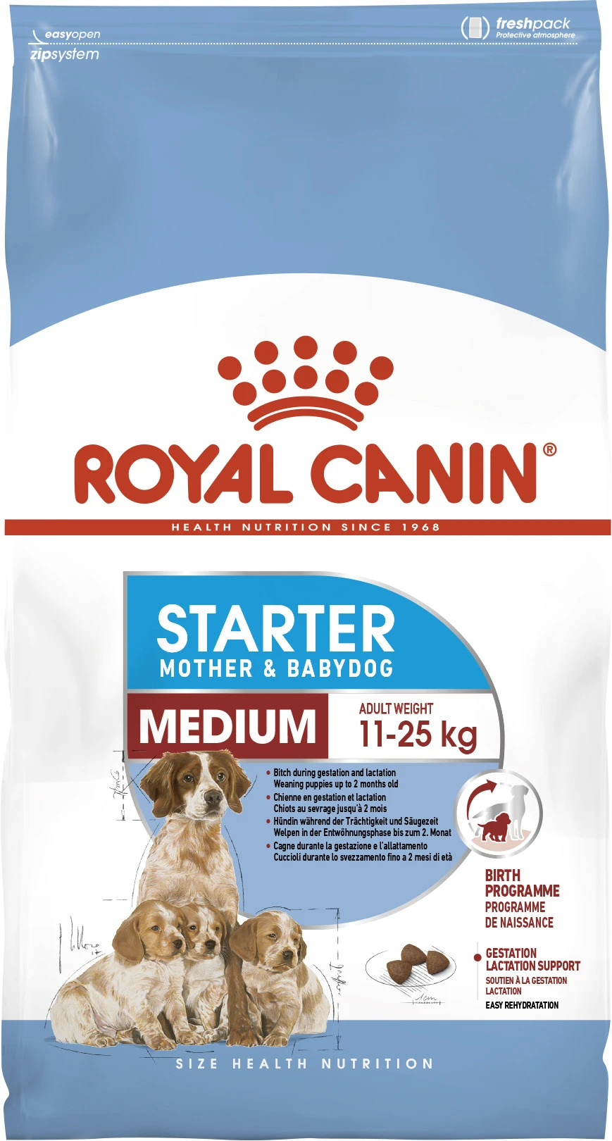 Раціон Royal Canin Starter Mother & Babydog Medium розроблений для цуценят собак великих розмірів, вага яких у дорослому віці від 11 до 25 кг. Сука в період вагітності та лактації, щенята від відлучення до 2 місяців.