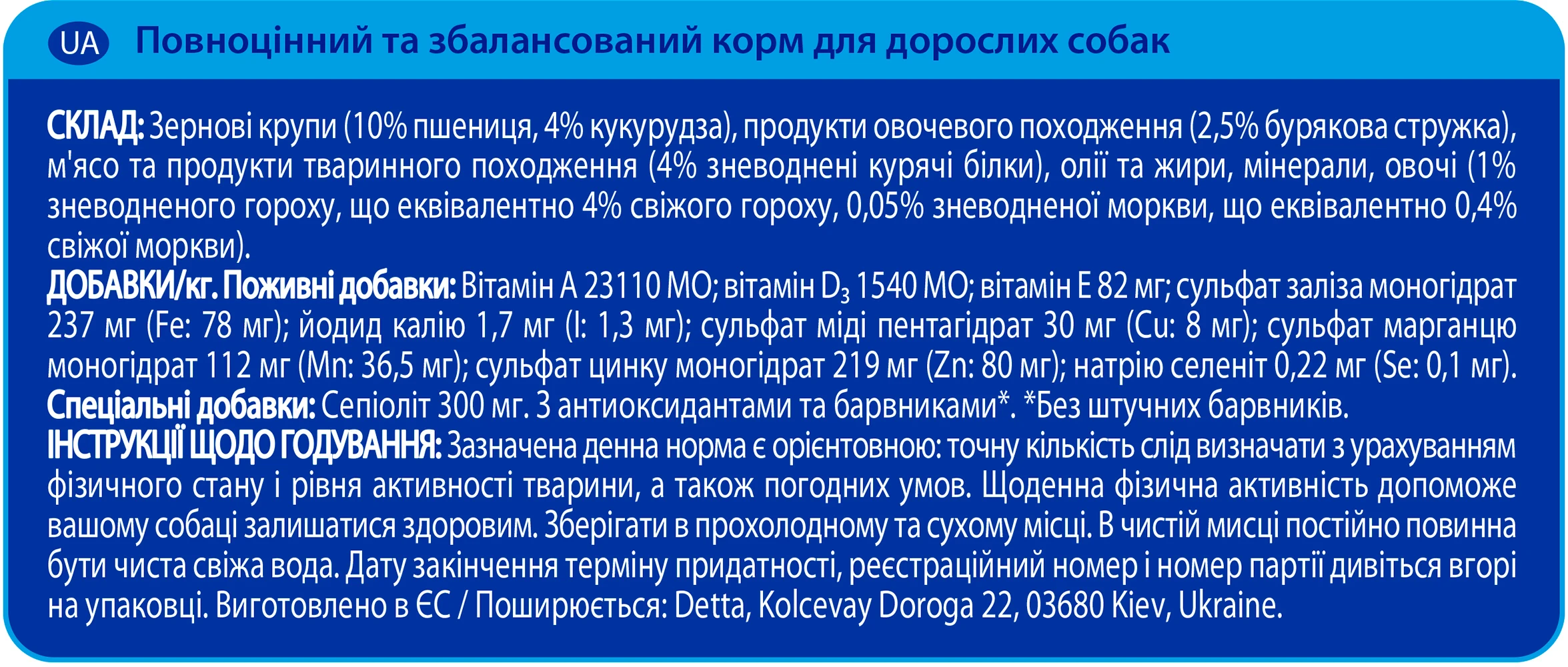 Склад: зернові крупи (10% пшениця, 4% кукурудза), продукти рослинного походження (2.5% бурякова стружка), м'ясо та продукти тваринного походження (4% зневоднені курячі білки), олії та жири, мінерали, овочі (1% зневодненого гороху, що еквівалентно 4% свіжого гороху, 0.05% зневодненої моркви, що еквівалентно 0.4% свіжої моркви).