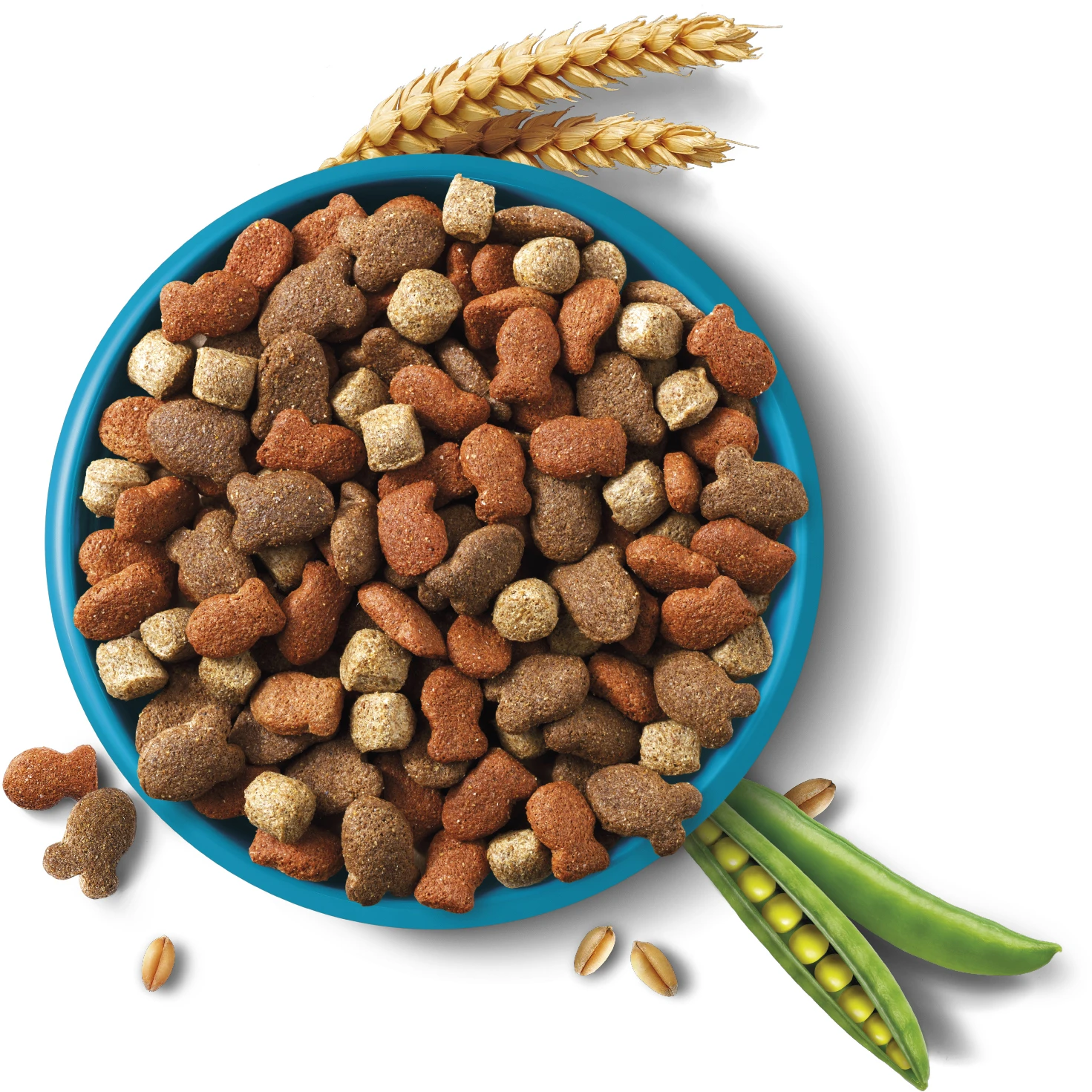 Склад: Зернові крупи (10% пшениця, 4% кукурудза), продукти рослинного походження (2.5% бурякова стружка), м'ясо та продукти тваринного походження, олії та жири, риба та продукти рибного походження (4% зневоднені лососеві білки), мінерали, овочі (1% зневодненого гороху, що еквівалентно 4% свіжого гороху, 0.05% зневодненої моркви, що еквівалентно 0.4% свіжої моркви).