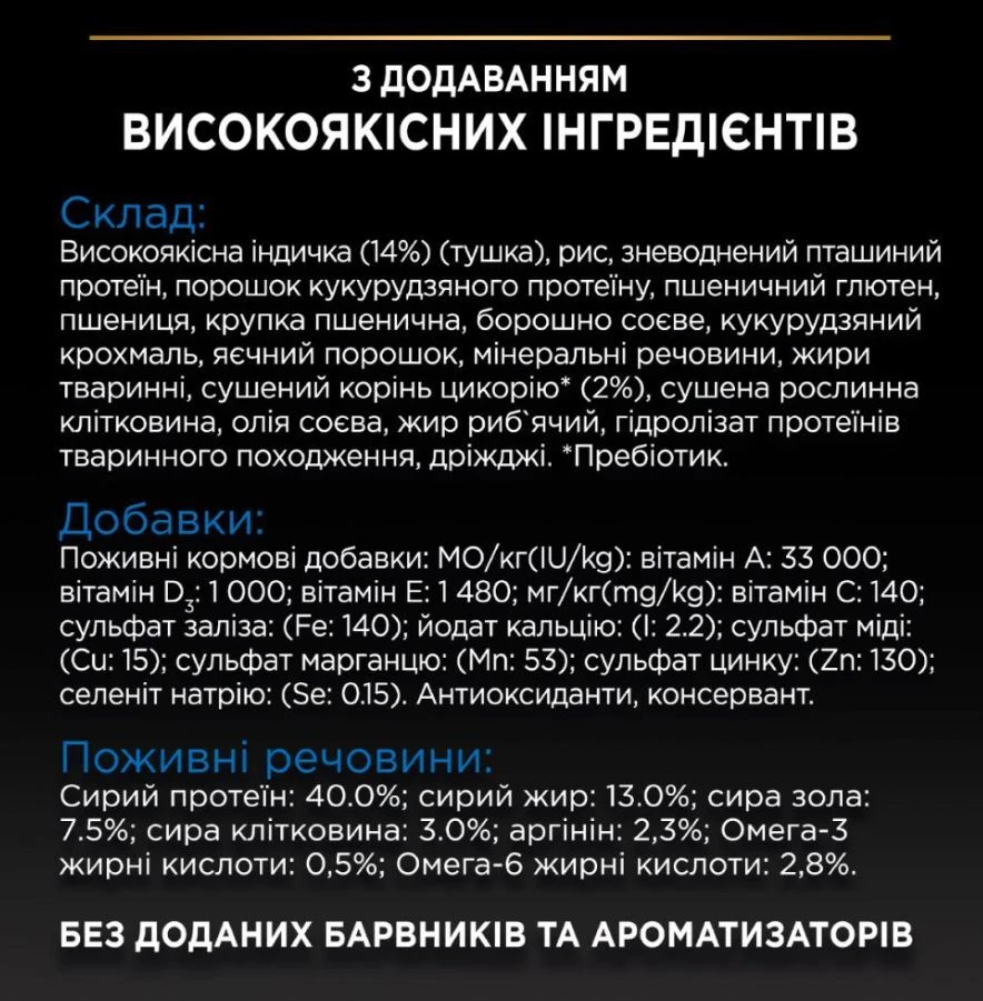 Склад: високоякісна індичка (14%) (тушка), рис, зневоднений пташиний протеїн, порошок кукурудзяного протеїну, пшеничний глютен, пшениця, крупка пшенична, соєва мука, кукурудзяний крохмаль, мінеральні речовини, тваринні жири, сушений корінь цикорію* (2%), сушена рослинна клітковина, соєва олія, рибний жир, гідролізат протеїнів тваринного походження, дріжджі.