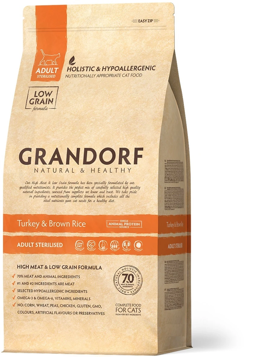 Сухий корм Grandorf Turkey & Brown Rice Sterilised — повнораціонне холістичне харчування для стерилізованих котів віком від 12 місяців на основі м'яса індички. У складі корму 70% м'ясних інгредієнтів. Збалансований склад з легкозасвоюваних інгредієнтів. Рекомендується для котів після кастрації або стерилізації, а також для літніх (mature) і схильних до повноти котів. Нормалізує і підтримує стан мікрофлори кишечника кота. Один джерело білка дозволяє використовувати цей корм в якості виключної дієти.