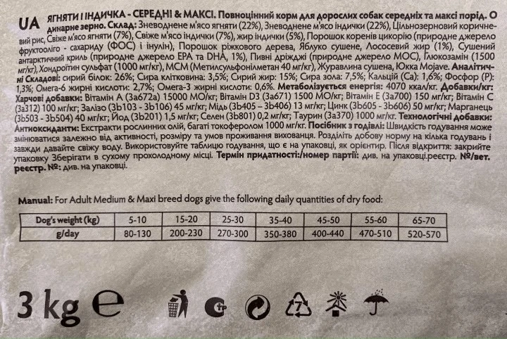 Состав: Дегидрированное мясо ягненка, Дегидрированное мясо индейки, Цельный белый рис, Свежее мясо ягненка, Свежее мясо индейки, Жир индейки, Экстракт цикория (естественный источник FOS и инулина), Мука из плода рожкового дерева, Сушеное яблоко, Сушеный Антарктический Криль (естественный источник EPA и DHA), Пивные дрожжи (естественный источник MOS), Таурин, Глюкозамин, Хондроитин, МСМ (Метилсульфонилметан), Юкка Шидигера, Комплекс натуральных антиоксидантов (Экстракт Розмарина, Грейпфрута, Апельсина, Куркумы и Сизигиума). Сохранено витамином С, розмарином и смесью природных токоферолов (источник натурального витамина Е).