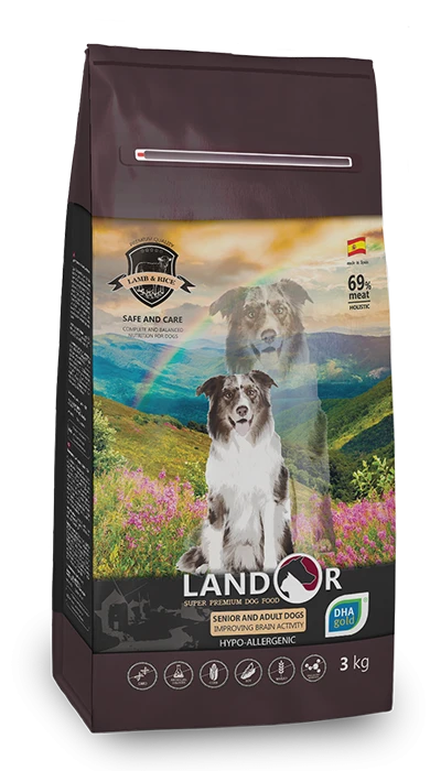 Собаки віком від 7 років потребують годівлі спеціалізованими кормами, з включеннями в них біологічно активних добавок, що дозволяють профілактувати захворювання, що часто виникають в зрілому віці. До складу корму SENIOR ми вводимо продукт DHAgold®, що складається з морських водоростей, дуже багатих Омега-3 жирними кислотами і містить як мінімум 17% докозагексаєнової кислоти. Завдяки цьому, корм LANDOR DOG SENIOR & ADULT сприяє покращенню мозкової діяльності, стану шкіри та шерсті, знижує ризик виникнення алергії, уповільнює розвиток запальних процесів і оберігає суглоби від руйнування.