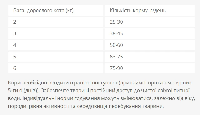 Енергетична цінність (калорійність) 100 г корму: 1666.28 кДж (398.26 ккал).