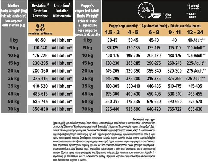 Рекомендації по годуванню (грам в добу) в залежності від віку та ваги: див. таблицю на упаковці: 1-й стовпчик "Очікувана вага цуценяти (після дорослішання), кг/kg", 2-й - 6-й стовпчики "Вік цуценяти (місяці) та відповідна кількість корму, г/g", 7-й стовпчик "Кількість корму при вагітності 6-9 тижнів (г/g)", 8-й стовпчик "Годуючим собакам годувати за їх потребою". Adult – керуйтеся рекомендаціями по годуванню корму для дорослих собак. Ці норми носять рекомендований характер.