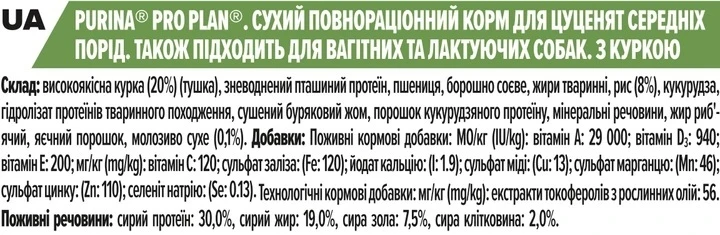 Сухий повнораціонний корм для цуценят середніх порід PRO PLAN з куркою, який також підходить для вагітних та годуючих собак.