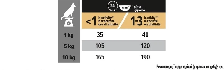 Використовуйте таблицю для визначення добової норми годування вашої собаки. Вказані норми рекомендовані для підтримання собаки в хорошій фізичній формі. Змінюйте добову норму годування залежно від рівня активності собаки, її фізичних особливостей та індивідуальних потреб. Слідкуйте, щоб у собаки завжди була чиста, свіжа питна вода. Для контролю здоров'я вашої собаки звертайтеся до ветеринарної клініки на регулярній основі.