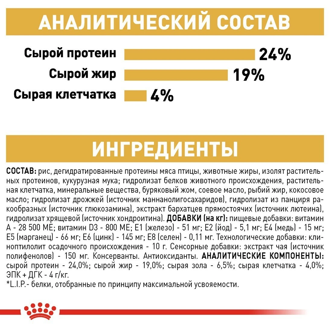 сирий протеїн – 24%; сирий жир – 19%; сира зола – 6,5%; сира клітковина – 4%; ЕПК та ДГК - 4 г/кг.