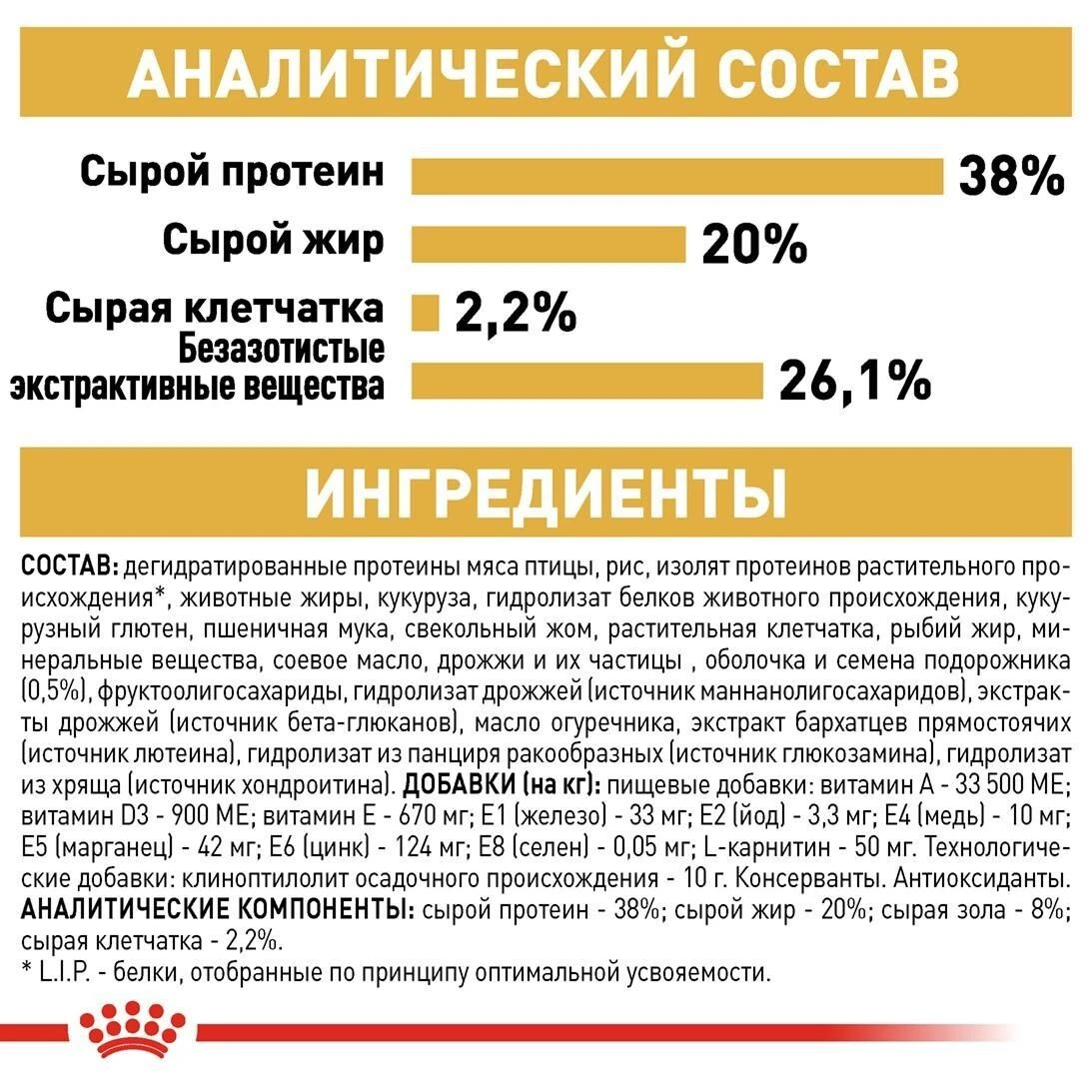 Дегідратовані протеїни м'яса птиці, рис, ізолят протеїнів рослинного походження, тваринні жири, кукурудза, гідролізат білків тваринного походження, кукурудзяний глютен, пшеничне борошно, буряковий жом, рослинна клітковина, риб'ячий жир, мінеральні речовини, соєва олія, насіння подорожника (0,5%), фруктоолігосахариди, гідролізат дріжджів (джерело маннанолігосахаридів), екстракти дріжджів (джерело бета-глюканів), олія огірковика, екстракт чорнобривців прямостоячих (джерело лютеїну), гідролізат з панці (Джерело хондроїтину).