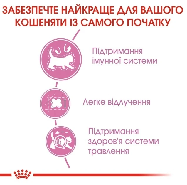 Чи годують дитину так само як дорослу людину? Очевидно, що ні. Діти мають чутливу травну систему, маленькі щелепи, у них немає зубів, тому вони, наприклад, не можуть відкусити яблуко. Ці факти полегшують розуміння того, чому кошенятам також потрібен не такий корм, як дорослим котам. Ріст кошенят триває не менше 12 місяців, залежно від породи та статі. Гама раціонів Royal Canin Kitten має оптимальні рішення для кошенят. Оберіть для них найкращі вологі та сухі раціони. Маленькі крокети, легке розгризання. Компанія Royal Canin є лідером у технології розробки крокет. Розмір, форма, текстура та щільність розроблені з урахуванням специфічних особливостей кошенят.
