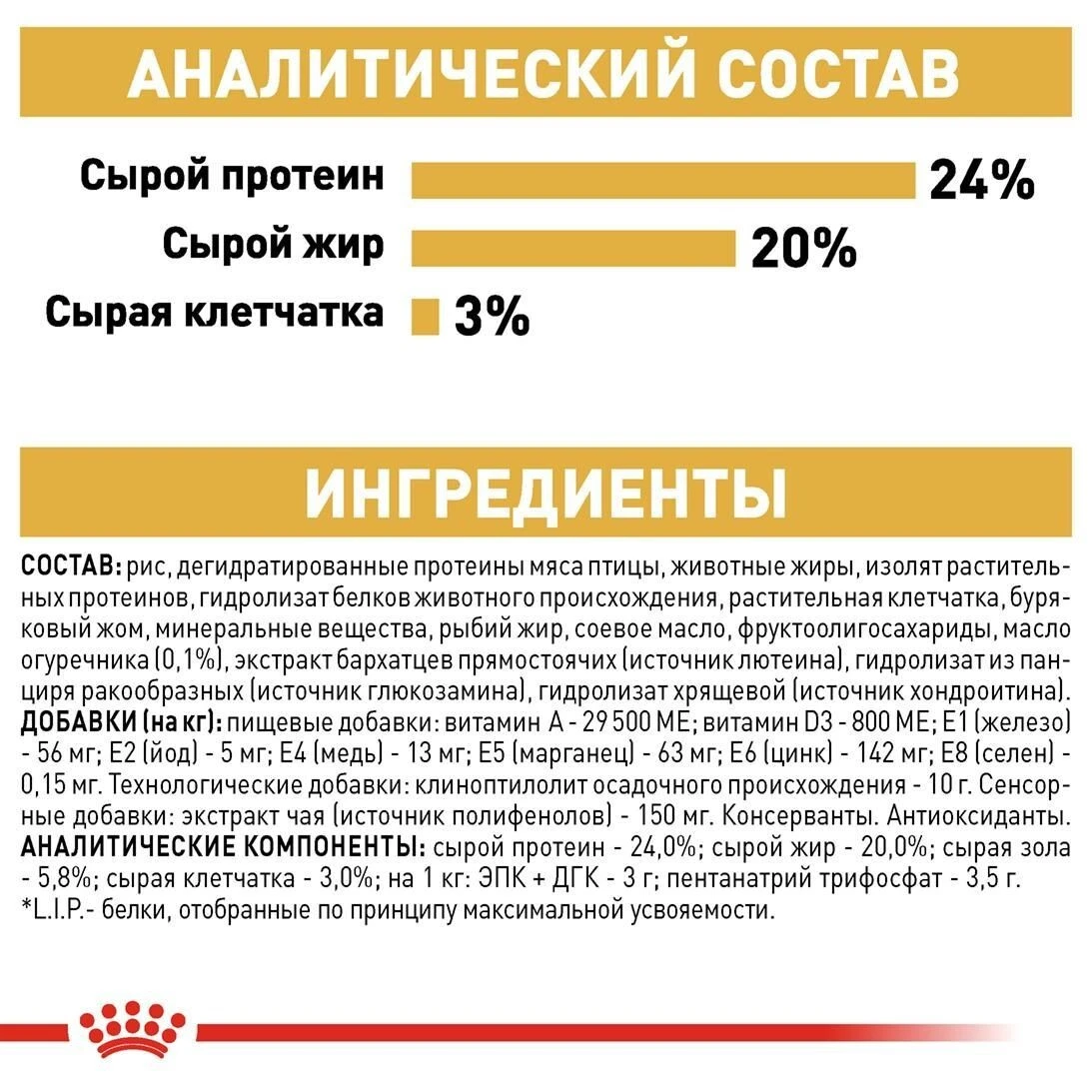 Рис, дегідратовані протеїни м'яса птиці, тваринні жири, ізолят рослинних протеїнів, гідролізат протеїнів тваринного походження, рослинна клітковина, буряковий жом, мінеральні речовини, риб'ячий жир, соєва олія, фруктоолігосахариди, олія огірковика (0,1%), екстракт бархат лютеїну), гідролізат з панцира ракоподібних (джерело глюкозаміну), гідролізат з хряща (джерело хондроїтину).