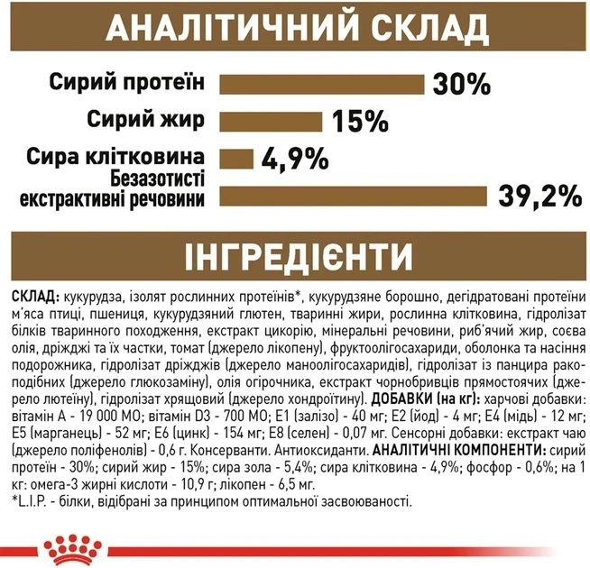 Кукурудза, ізолят протеїнів рослинного походження*, кукурудзяне борошно, дегідратовані протеїни м'яса птиці, пшениця, кукурудзяний глютен, тваринні жири, рослинна клітковина, гідролізат білків тваринного походження, екстракт цикорію, мінеральні речовини, дріжджі та їх частки , томат (джерело лікопена), фруктоолігосахариди, оболонка і насіння подорожника, гідролізат дріжджів (джерело маннанолігосахаридів), гідролізат з панцира ракоподібних (джерело глюкозаміну), олія огірковика джерело хондроїтину).