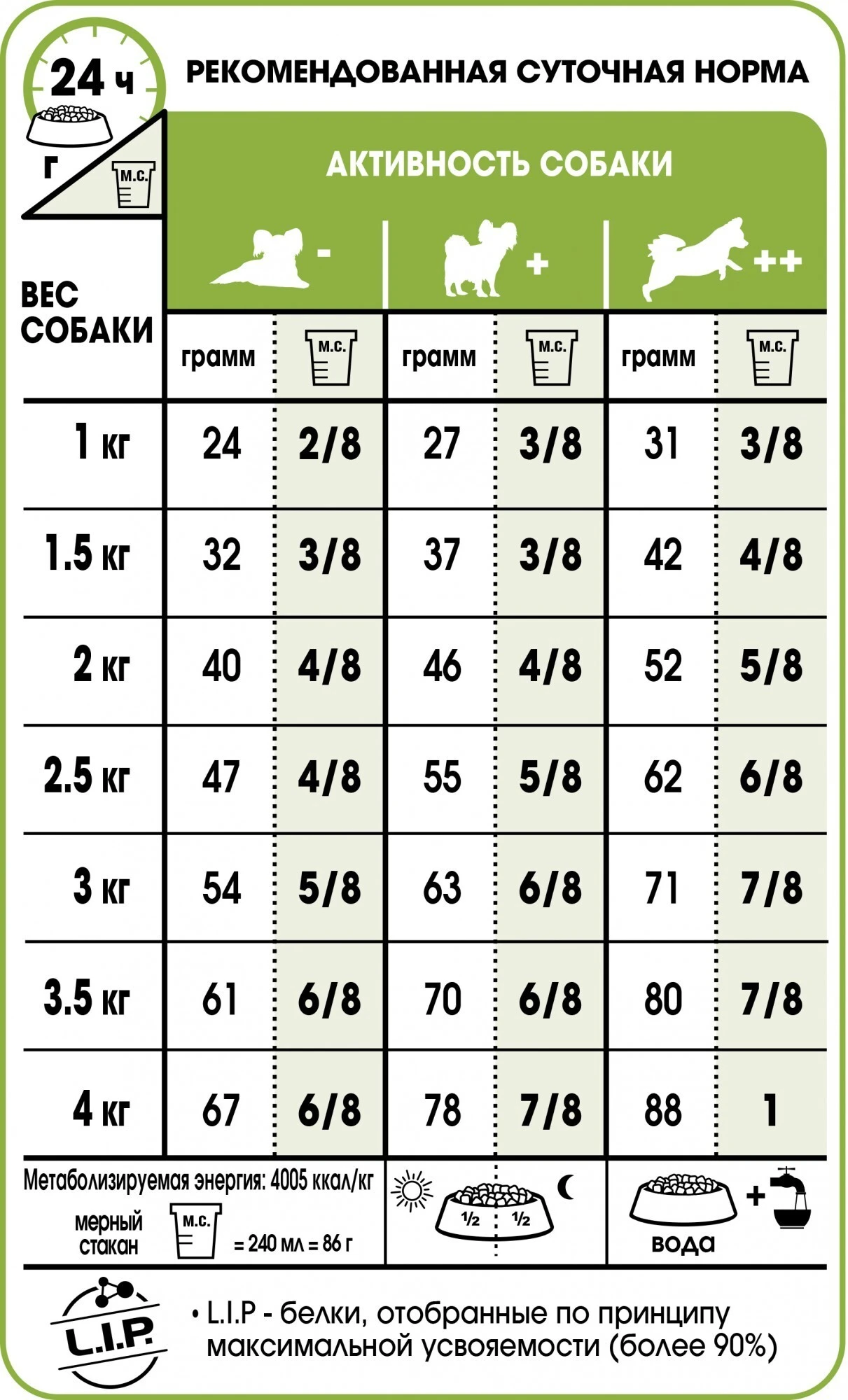 Сухий корм для дорослих собак мініатюрних розмірів від 10 місяців до 8 років. Забезпечує необхідний рівень енергії для активного життя. Підтримує комфортний процес травлення і не порушує мікрофлору кишечника. Спеціальні добавки надають здоровий блиск шерсті та захищають шкіру. Забезпечує надійний захист сечовидільної системи. Має високу смакову привабливість. Маленький розмір крокет зручний для захоплення.