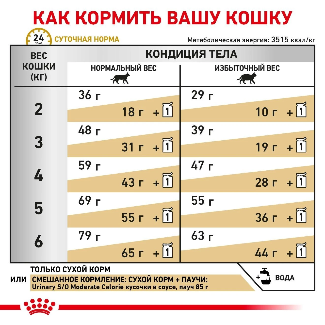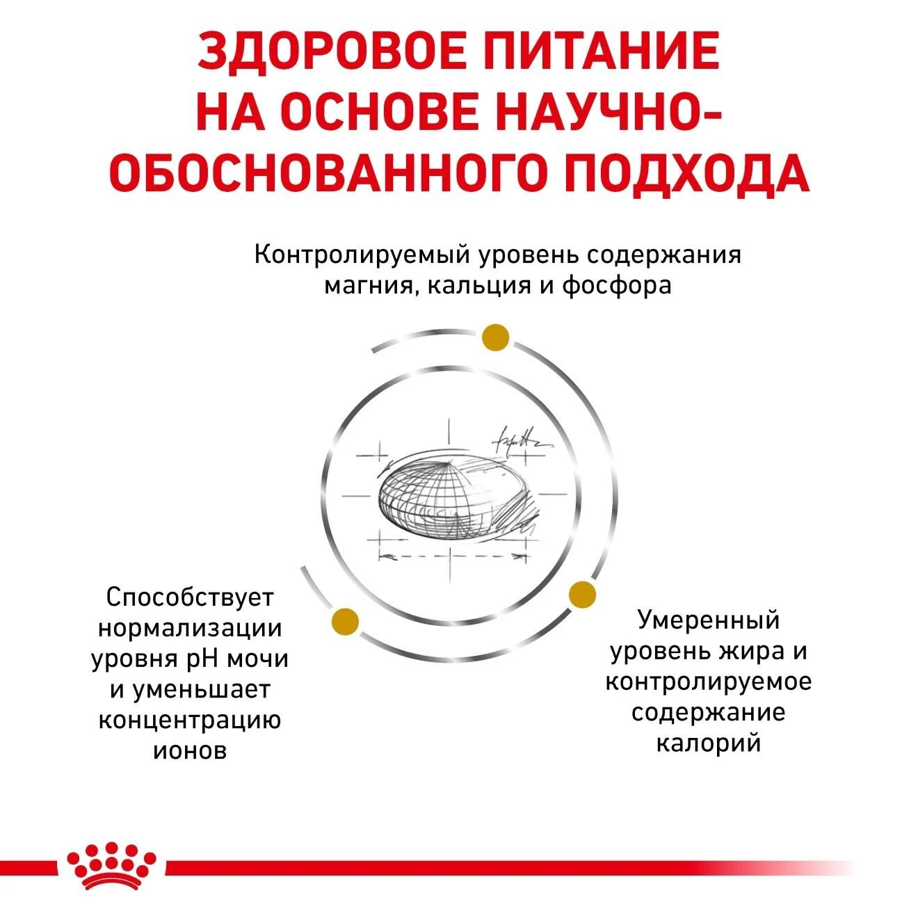 сирий білок - 34%; сирий жир - 11%; сирий попіл - 8,8%; сирий клітковина - 7%; кальцій - 1%; фосфор - 0,9%; натрій - 1,2%; хлориди - 2,14%; калій - 1%; магній - 0,06%; сірка - 0,7%; загальний таурин - 0,22%; ЕПК & ДГК - 0,32%; L-карнітин - 200 мг/кг. Речовини, які підкислюють сечу: кальцій сульфат (1,3%), DL-метіонін (0,43%).