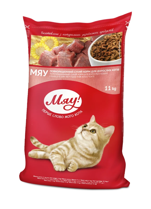 кукурудза, білково-мінеральний концентрат (м'ясо, субпродукти), рис, тваринний жир, кормова добавка для покращення апетиту (гідролізована печінка), мінеральний премікс, соняшникова олія, вітамінний премікс (таурин), пивні дріжджі, антиоксидант (Термокс), консервант (сорбат калію), барвник Е 124.