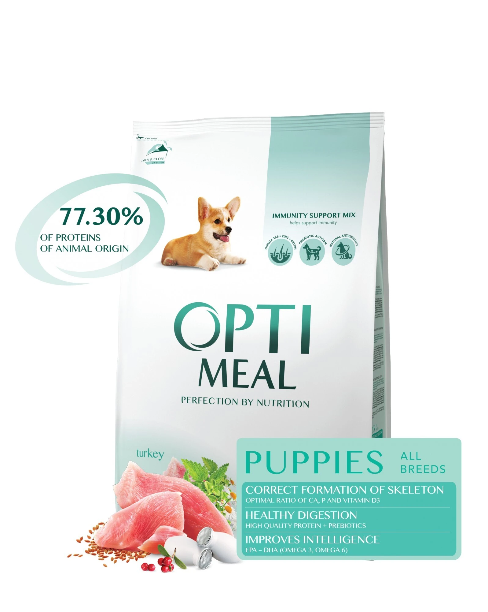 Кожен шматочок ретельно приготованого харчування Optimeal для цуценят і собак у період лактації містить оптимальну кількість м'яса, жирів, вітамінів, трав, гарантуючи міцний імунітет та максимум сил для активного зростання вашого цуценяти.