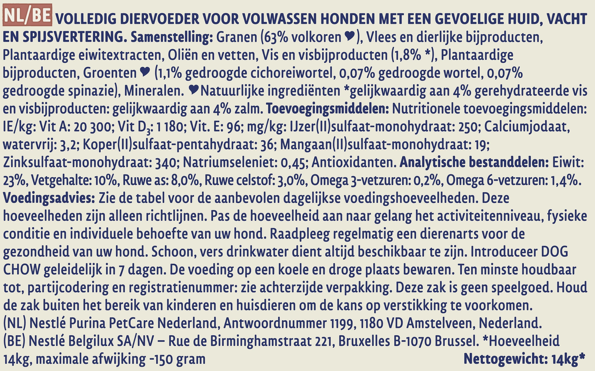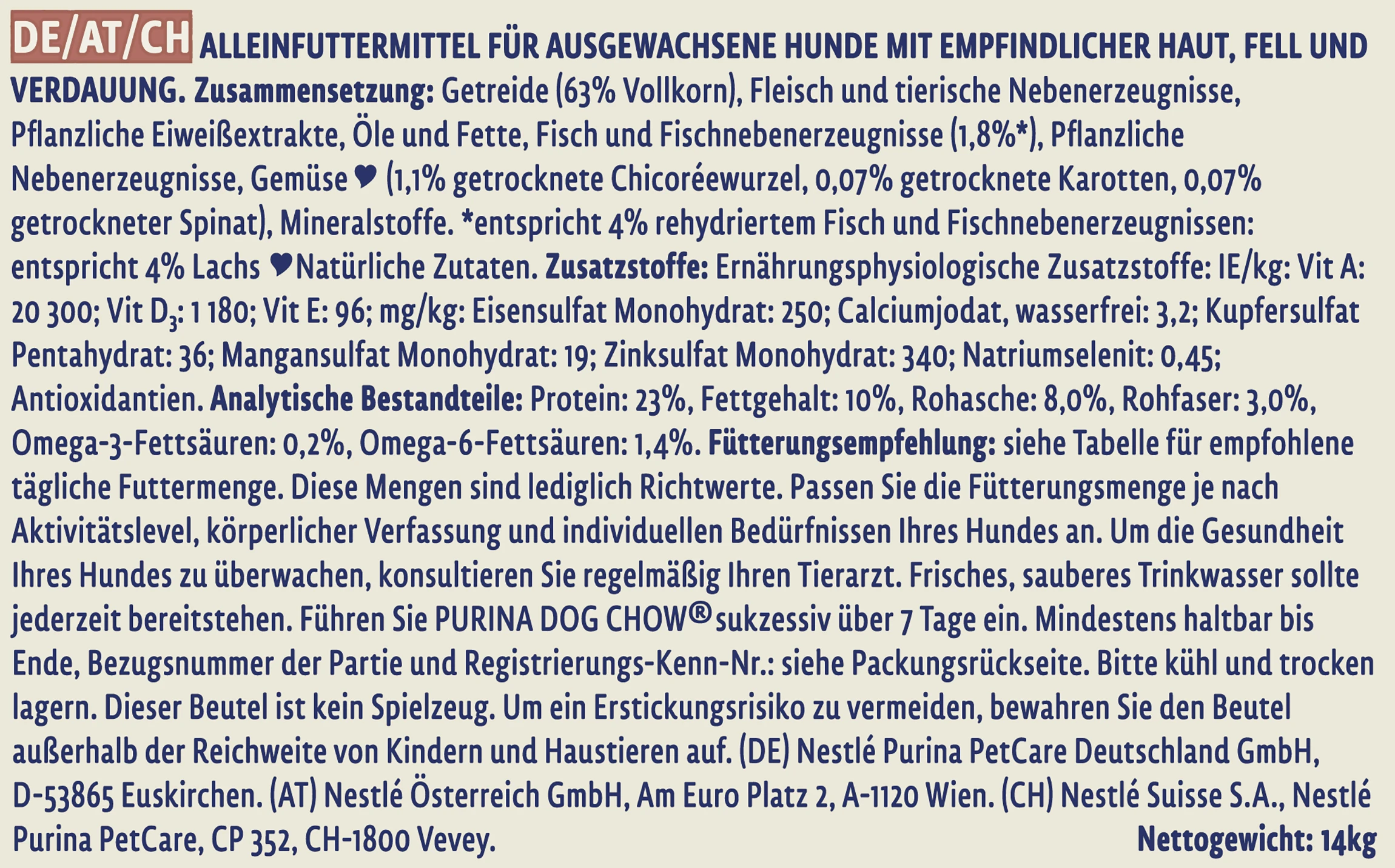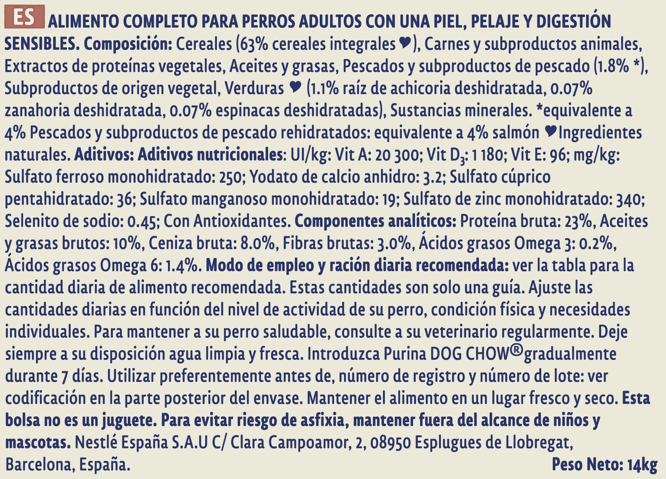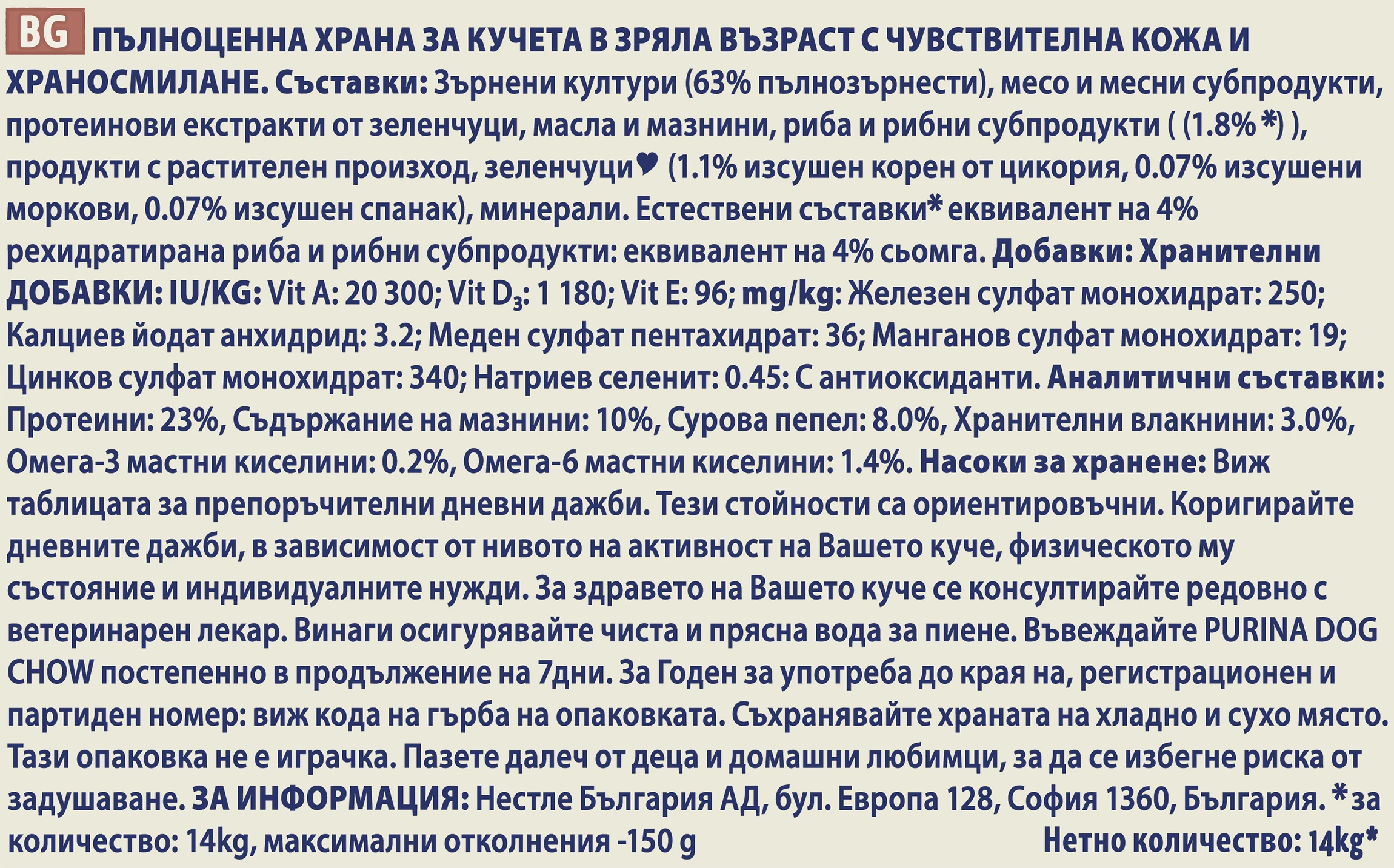 Некоторые взрослые собаки страдают от проблемы чувствительной пищеварительной. Поэтому Dog Chow с лососем был создан именно для таких питомцев. Природный источник Омега-3 жирных кислот и витамина А уменьшает воспалительные процессы в желудочно-кишечном тракте. Также цикорий, как пребиотик способствует нормализации микрофлоры в кишечнике, а витамины Е и С действуют как антиоксиданты и поддерживают естественные защитные системы организма.