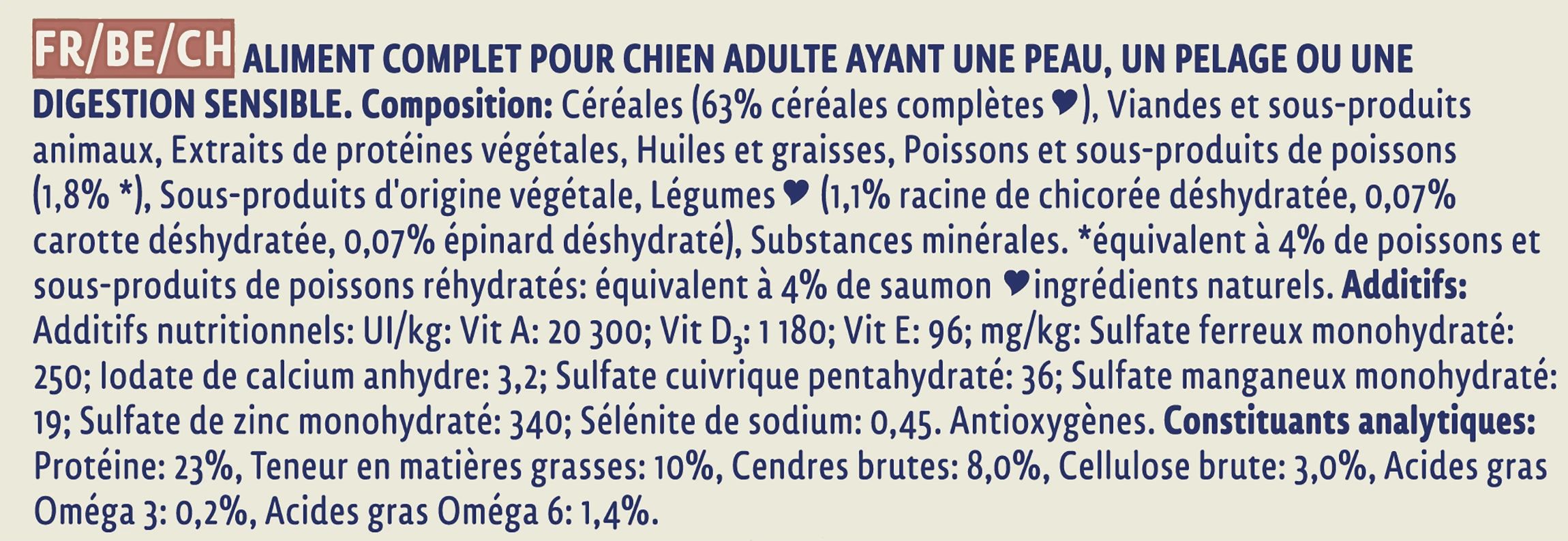 Состав: зерновые (63% цельнозерновые), мясо и субпродукты животного происхождения, экстракты растительного протеина, жир животный, рыба и продукты переработки рыбы (1.8% *), продукты переработки овощей, овощи ** (1.1% сушеного корня цикория, 0.07 % сушеной моркови, 0.07% сушеного шпината), минеральные вещества. * Эквивалентно 4 * регидратированных рыбы и продуктов переработки рыбы, эквивалентно 4% лосося. ** Натуральные ингредиенты.