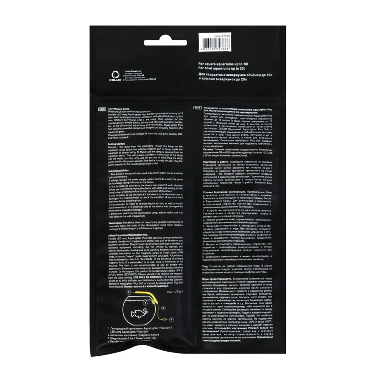 LED-світильник AquaLighter PicoSoft — перший у світі гнучкий світильник для акваріума. Відмінне рішення для утримання невибагливих рослин, креветок і дрібних видів риб в акваріумах малих обсягів, а також для освітлення флораріуму. Гнучкий корпус з приємним покриттям і підключення до роз'єму USB робить його максимально універсальним. Магнітне кріплення дозволяє з легкістю розміщувати світильник на стінках будь-якої товщини і форми. -Ультрасучасний дизайн -Низьке енергоспоживання Колірна температура вигідно підсилює кольори риб і рослин -Високий ступінь безпеки та надійності -Гнучкий корпус дозволяє розмістити світильник на акваріумах будь-якої форми -3D-ефект освітлення візуально робить пико-акваріум значно об'ємнішим -В якості джерел світла використовуються надяскраві світлодіоди світового лідера — фірми OSRAM (Німеччина): Duris E5 Cool White (6500К)