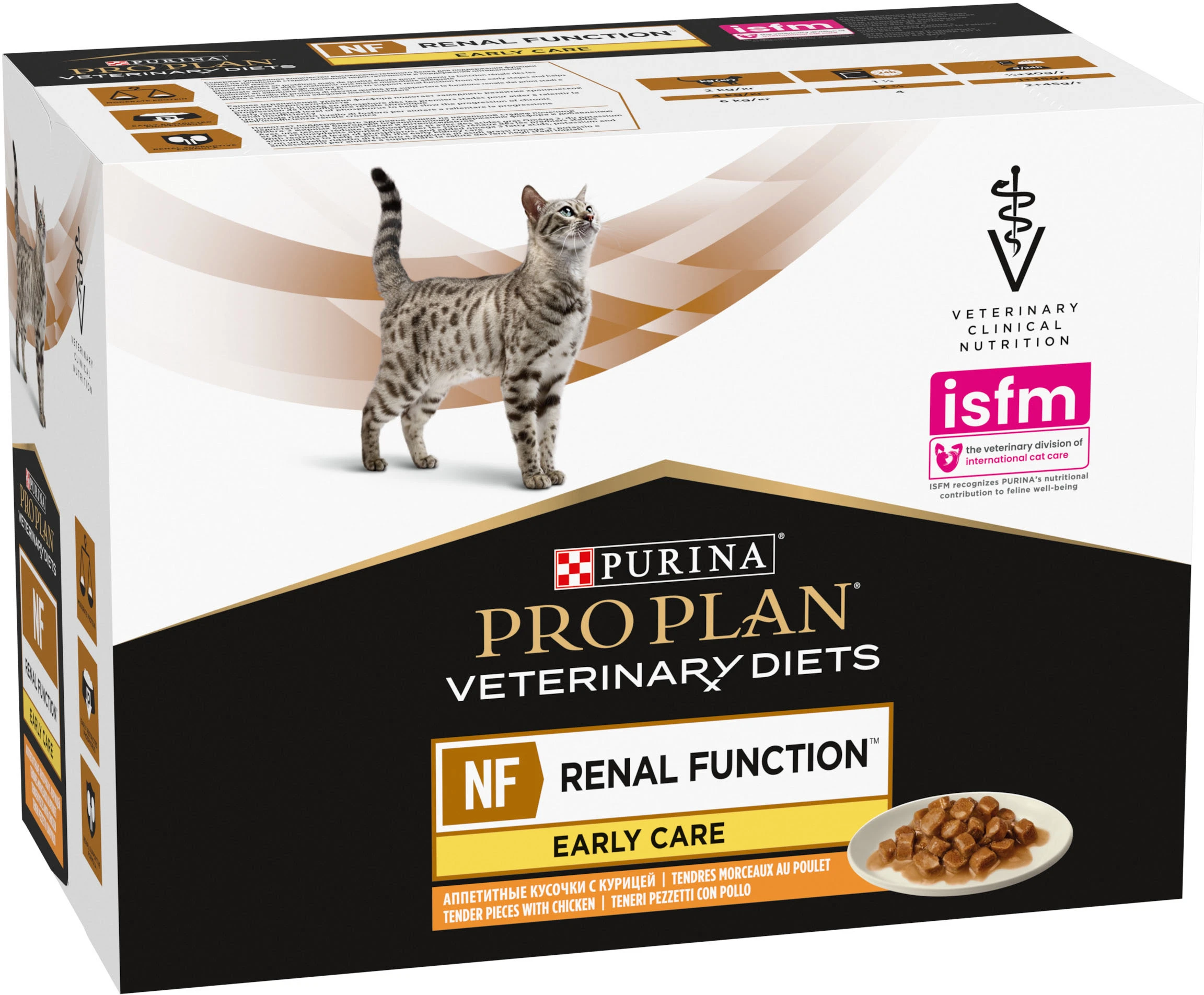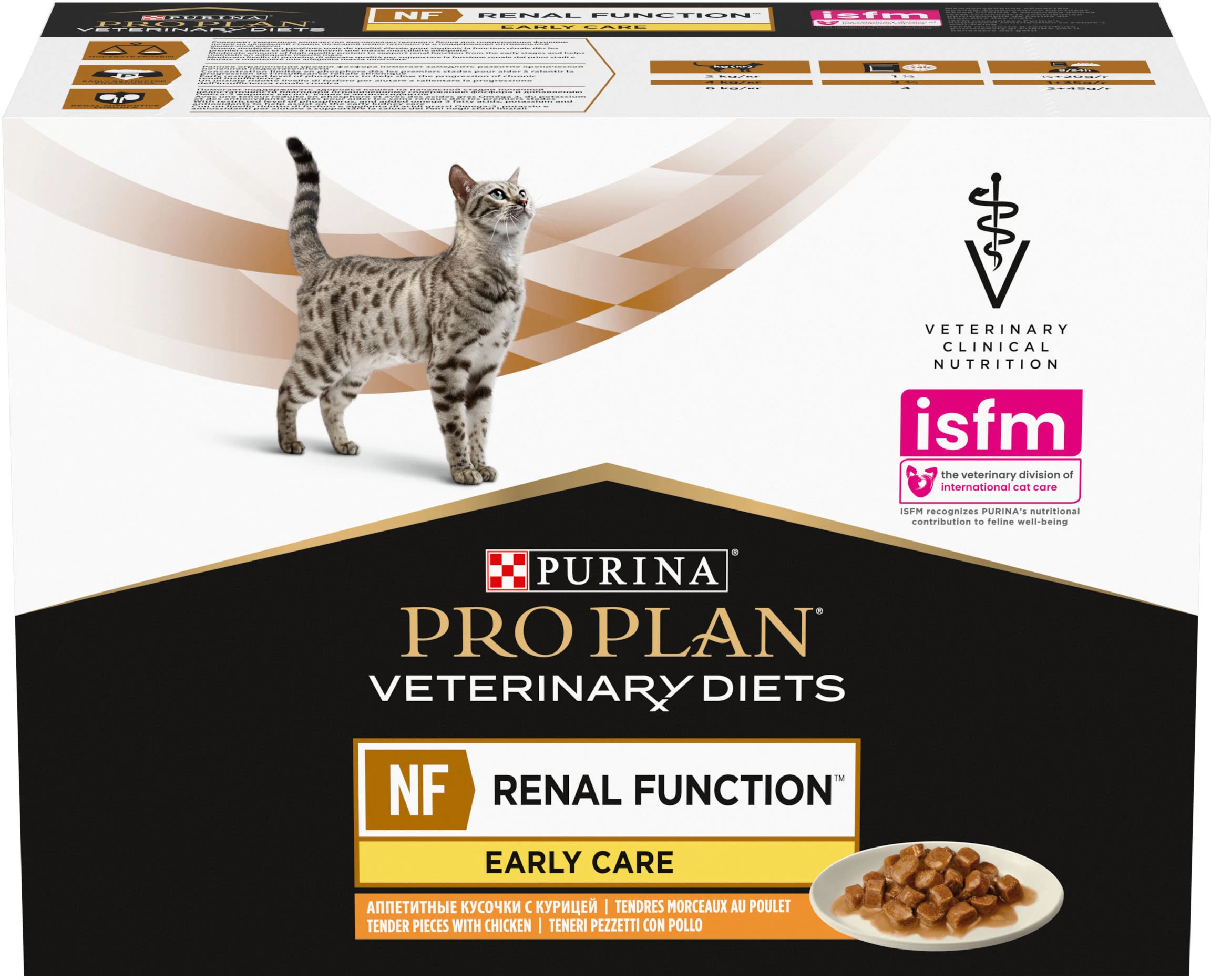 Purina Pro Plan Ветеринарна дієта NF Ренал Function Early Care - Ветеринарна дієта НФ Ренал Функція Ранній Догляд. Це консервований порційний повнораціонний дієтичний корм зі смаком курки для дорослих котів для підтримки функції нирок при хронічній хворобі нирок на ранніх стадіях.