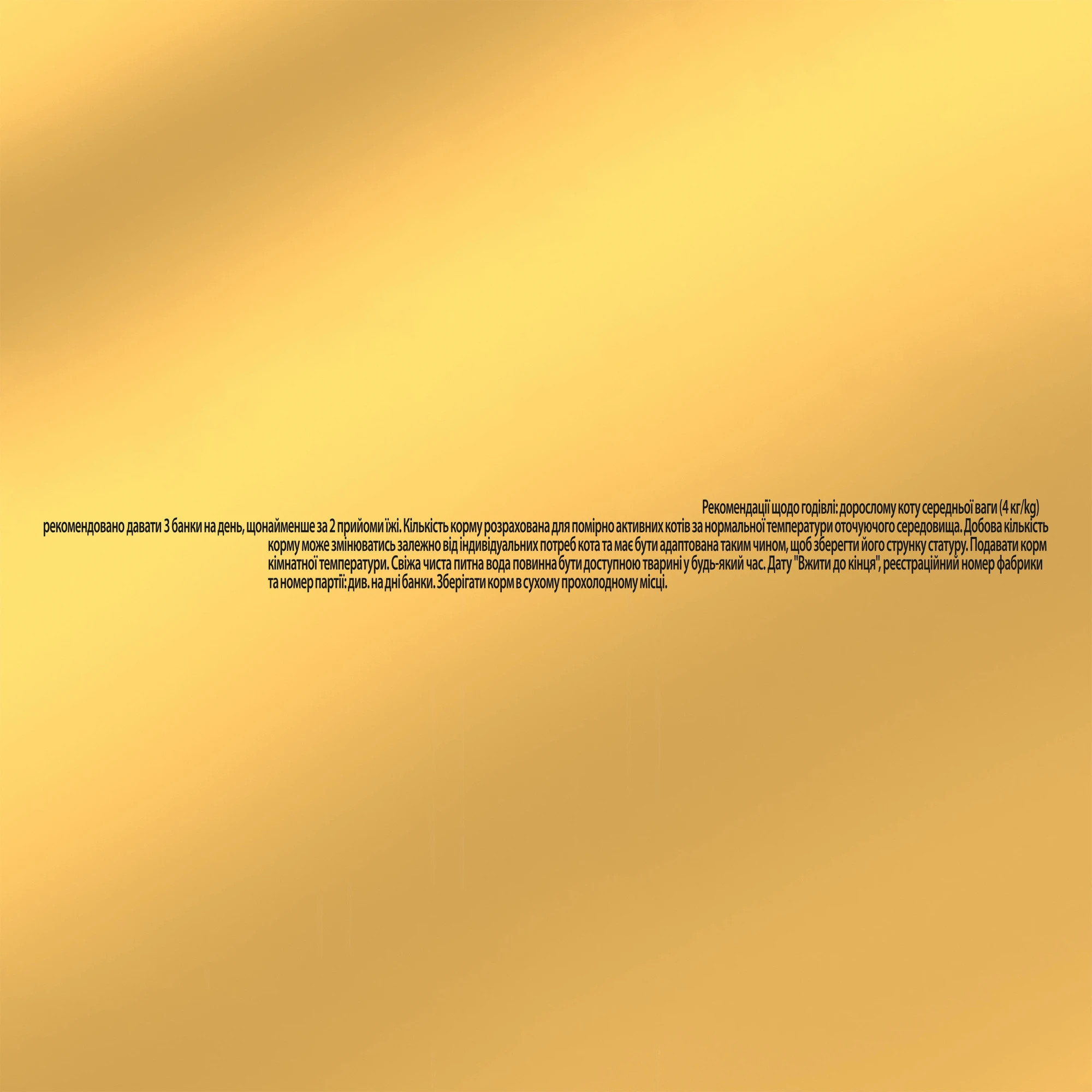 Рекомендации по кормлению. Взрослому коту среднего веса (4 кг) рекомендуется давать 2-3 баночки в день, по меньшей мере, за 2 отдельных кормления. Средняя суточная норма рассчитана для умеренно активных кошек при температуре окружающей среды. Суточная норма может изменяться в зависимости от индивидуальных потребностей кота и должна быть приспособлена, чтобы сохранить его стройное телосложение. Подавать корм комнатной температуре. Свежая чистая питьевая вода должна быть доступна животному в любое время.