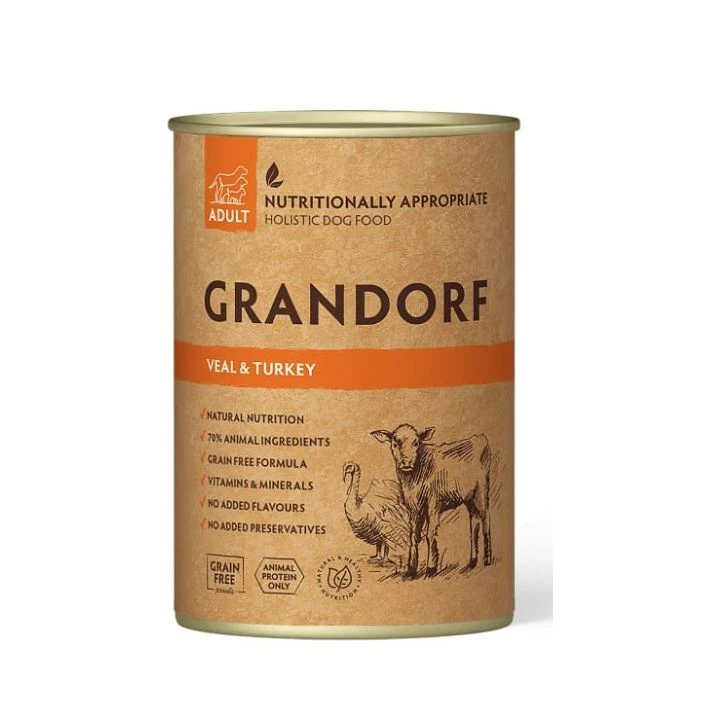 Grandorf - влажный корм для взрослых собак всех пород с нормальной активностью, чувствительным пищеварением или склонностью к аллергии.